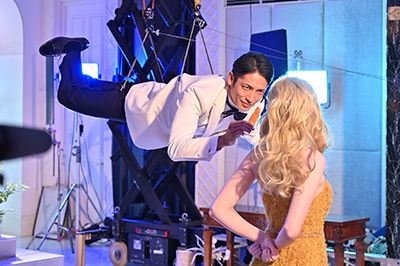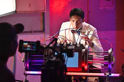 天井からワイヤーで降りてきて、囚われている女性を救出しようとするシーンでは、およそ5メートルの場所から約1時間半もの間、ワイヤーで吊られたままというハードな撮影に臨んだ玉木さん。スパイとして颯爽と登場する大きな見どころのカットですが、撮影ではうつ伏せの状態で上に行ったり下に行ったりと、幾度となく上下動を繰り返し、また終始不安定な体勢でセリフを発するというような、ユーモラスさも感じられるシーンが続きました。そんな中でも玉木さんは顔色一つ変えず、スタッフともコミュニケーションを取りながら、次々とOKテイクを重ねていました。