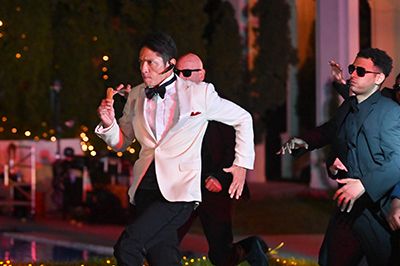 2日間に渡る撮影のラストカットは、ミッションを終えたスパイが黒服の敵集団に追われながら逃亡する場面。このシーンはプールが備わった広々としたロケ地の庭をいっぱいに使って撮影しました。レールに載せたカメラがプールサイドから逃走劇を撮影する、ハリウッド映画さながらのワンシーンで、勢いよく飛び出してすぐに全力疾走する玉木さんの手にはマックTHEチキンが。監督の口から「OK!」の声が飛び出すと、スタッフ、共演者の皆さんからは映画の“クランクアップ”のように大きな拍手と歓声が沸き起こりました。