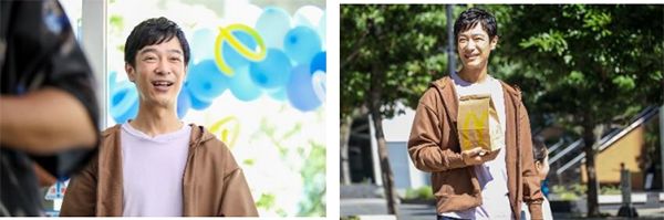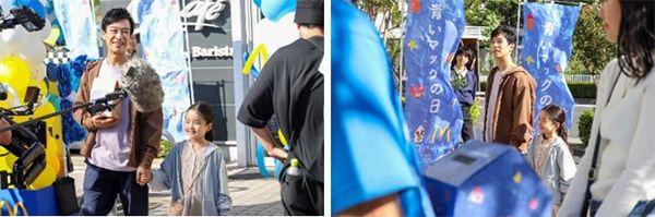 新TVCMは昨年に続き堺雅人さんが父親、そして鈴木凛子さんが娘を演じ、いつものように手をつなぎながら散歩を楽しむ中で、初めて見るマクドナルドの青いデリバリーバイクに遭遇するほか、風船やPOPで青い装飾が施された店舗を訪れることで、一年で一番マクドナルドのチャリティが盛り上がる“青いマックの日”であると思い出す様子を描いています。多くのお客様で賑わう店内ではチャリティ活動も大きく盛り上がり、その中には人気動画クリエイター“フィッシャーズ”で青のメンバーカラーを担当するマサイさんが特別サポーターとして参加する姿も。その光景に興奮した娘が堺さんの手を振り払って憧れの“青い人気者”に駆け寄ると、堺さんは一瞬、唖然とした表情を見せながらも娘の嬉しそうな姿を優しく見守り、自身も“青いマックの日”を楽しみながら盛り上がりに加わります。