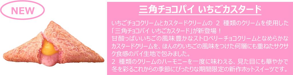 新登場の「三角チョコパイ いちごカスタード」は、甘酸っぱいいちごの風味豊かなストロベリーチョコクリームとなめらかなカスタードクリームの2種のクリームの絶妙なバランスを堪能いただける一品で、サクサク食感のパイ生地には、ほんのりいちごの風味をつけました。見た目にも華やかで、冬を彩る期間限定のホットスイーツです。