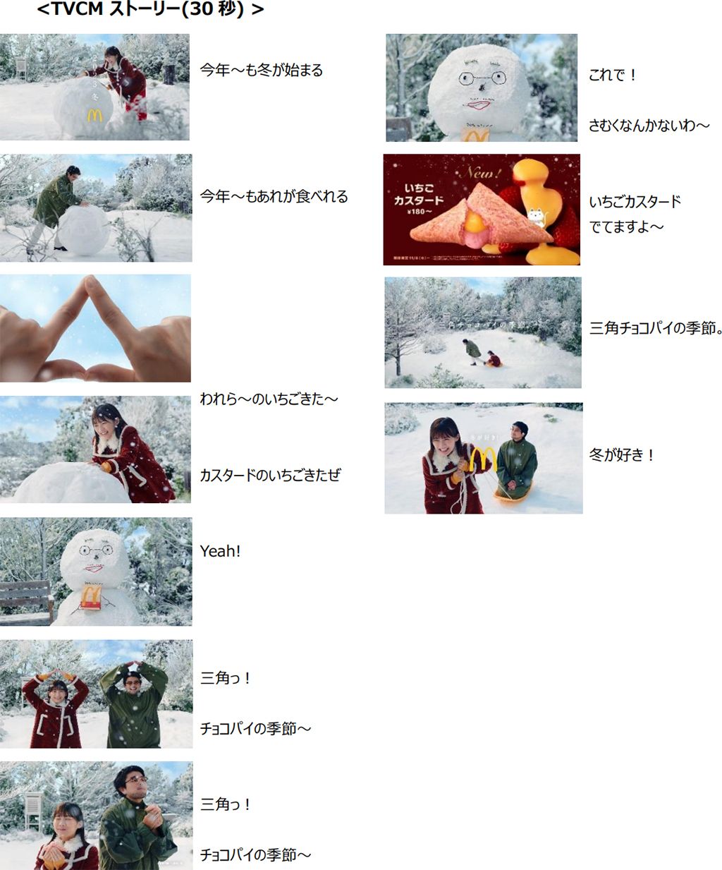 11月7日(火)からは、伊藤沙莉さん、井口理さん(King Gnu)のCM共演第2弾となる「三角チョコパイ いちごカスタード」篇をオンエアします。「三角チョコパイ」の季節到来の嬉しさを、雪のなかではしゃぎながら楽しく踊るシンクロダンスと、お二人が歌う「三角チョコパイの歌」でコミカルに表現しました。