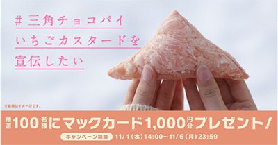 「#三角チョコパイいちごカスタードを宣伝したい」のハッシュタグを付けて、「#三角チョコパイいちごカスタードを宣伝したい」のハッシュタグが付いた投稿(キャンペーン対象のポスト)を引用ポストすると、抽選で100名様にマックカード1,000円分が当たります。