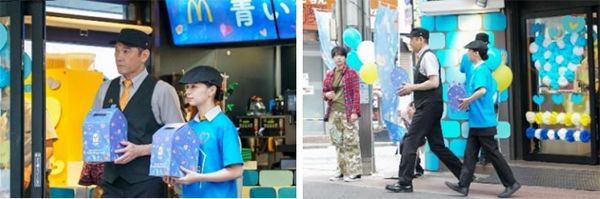 新TVCMは、青いマックの日に向けて大きな“青い輪”となり、病気と向き合う子供たちやそのご家族を支援するDMHへのチャリティが広がっていく様子を描いています。マクドナルド店舗を青色に装飾しながらお客様を迎える準備を進めていた店長役の杉本哲太さん、そしてクルーを演じる上國料萌衣さんが駅前で開催される“青いマックの日”のイベント会場に足を運ぶと、そこには特別サポーターとして“青色の姿”で駆けつけた株式会社サンリオのキャラクター・マイメロディや大勢のボランティアの方々、そしてチャリティに協力しようと足を運んでくれた多くの人々の笑顔が…。“青いマックの日”がみんなの協力によって盛り上がり支援の輪が広がっていくことを実感しながらも、さらに青いマックの日を盛り上げ広げていこうとする杉本さんと上國料さんにご注目ください。