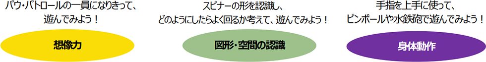 個性豊かな子犬たちが、それぞれの特技を活かして協力し、街の問題を解決してゆく「パウ・パトロール」の物語は、自分のまわりの多様な友達や、地域のために働く人たちへの関心を高めてくれます。「自分がパウ・パトロールのメンバーだったら、交通ルールを守って歩かなくちゃ!」と想像するだけで、道路の様子や、車を運転する人に注目できるようになるかもしれません。手のひらにのる小さなおもちゃが、物語世界を現実に広げてくれるのです。指先を器用に動かして遊ぶ、モバイルおもちゃと共に、礼儀正しく楽しいお出かけをしてみましょう。