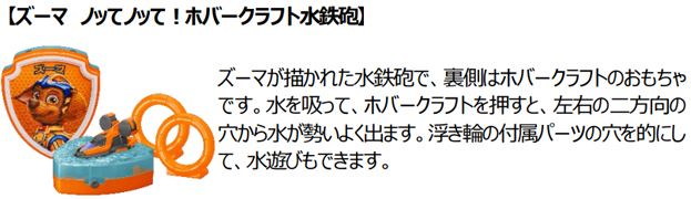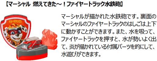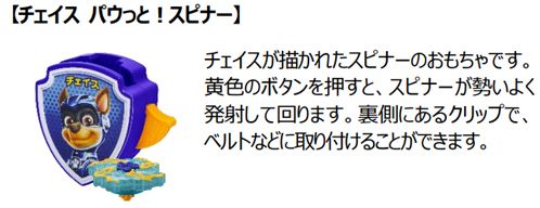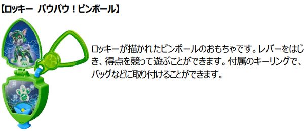 ハッピーセット「パウ・パトロール」は、劇中に登場するキャラクターをモチーフにしたピンボールやスピナー(コマ)、水鉄砲など、バッジ型おもちゃ全6種類のラインアップです。パウ・パトロールの一員になりきり、ストーリーの想像をふくらませて、いろいろな遊びが楽しめます。スピナーや水鉄砲の形や、おもちゃの仕組みを観察して、図形と空間の認識を育み、球をはじいたり、的をねらったりする動作を繰り返す内に、手指の器用さ(身体動作)が養われます。おもちゃは、子供の手におさまる小型サイズなので、お出かけに携帯するのにぴったりです。