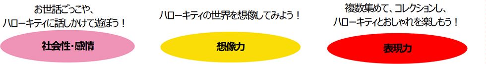 キティちゃんは、どんなに変わった装いをしていても、キティちゃんだとわかる個性を持ち続けて、はや半世紀。 世界の子どもたちが、キティちゃんのお世話をして遊んでいます。お世話ごっこの中では、「自分がキティちゃんだったら、どうして欲しいかな?」と想像する場面がたくさんあります。大好きなマスコットに気持ちを重ねながら、共感する遊びを楽しんでいるのです。「この服を着て、こんなお仕事をしたり、あんな人と会ったりしたいな」という、おしゃれの想像も、人とつながる表現力を伸ばします。お世話やおしゃれの遊びを通して、豊かな社会性を育みましょう。