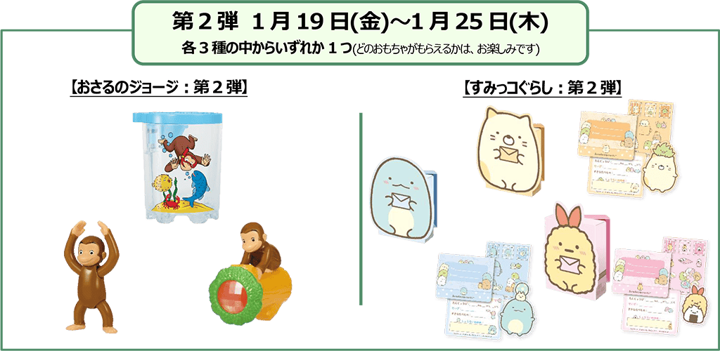 1月13日(土)・14日(日)の2日間は、ハッピーセット「おさるのジョージ」を1セットご購⼊につき「おさるのジョージ ジョージとおともだちシール」を、ハッピーセット「すみっコぐらし」を1セットご購⼊につき「すみっコぐらし おてがみシール」をプレゼントいたします。