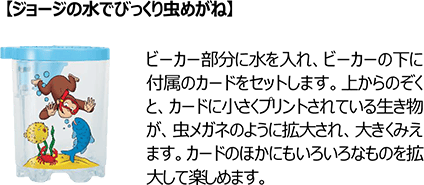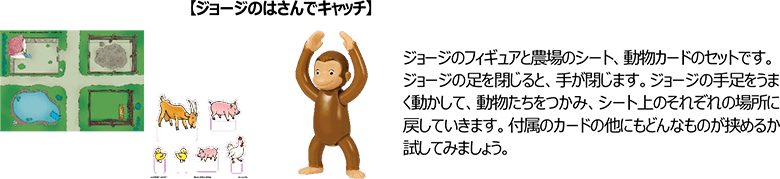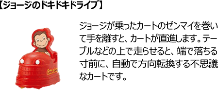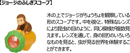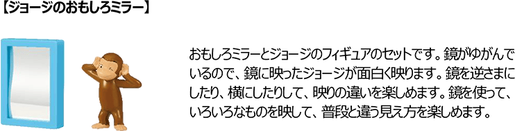 ハッピーセット「おさるのジョージ」は、好奇心旺盛なジョージと一緒に大冒険が楽しめる仕掛けつきのおもちゃ全6種類をラインアップしました。今回のおもちゃには、自然科学と生命への好奇心や想像力を豊かにし、図形・空間の認識を深める仕掛けがあります。「おもしろ ミラー」で鏡に映した形の変化を楽しんだり、昆虫の目のような「ふしぎスコープ」で一つのものがたくさんに増えて見えるのを確かめたりすることで、図形や空間のイメージが広がります。また、テーブルの端で“くるっと”自動で方向転換できるカート「ドキドキドライブ」には、段差があっても落下しない仕組みがあります。手を動かして試しながら、「なぜ?」「どうして?」と、仕組みや働きを考えて遊べば、科学的な思考が育まれます。ジョージと一緒に、いろいろな冒険の物語を想像して遊べるおもちゃです。