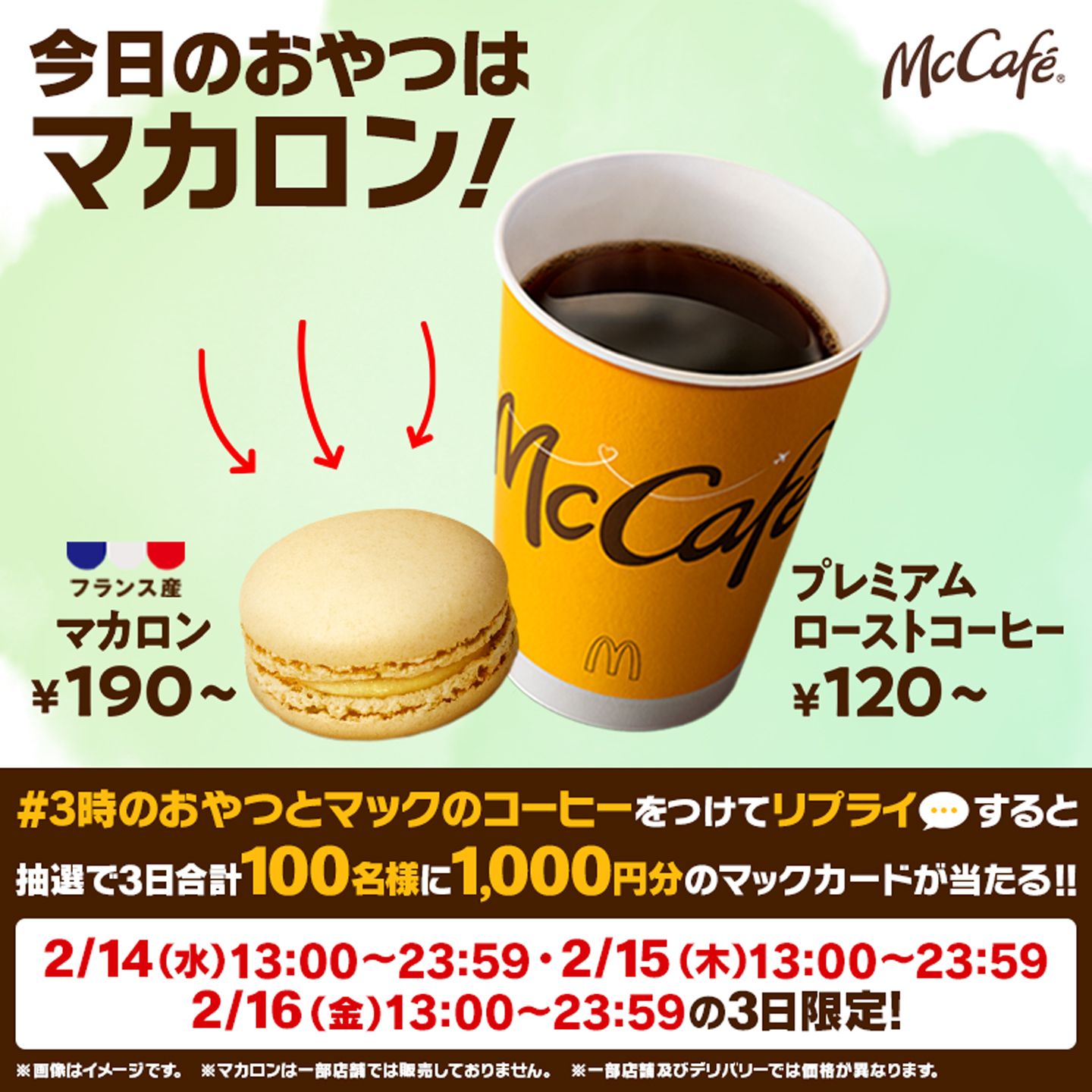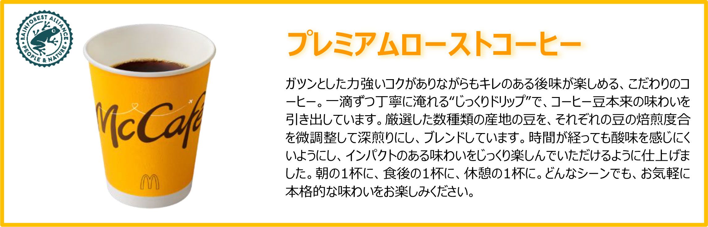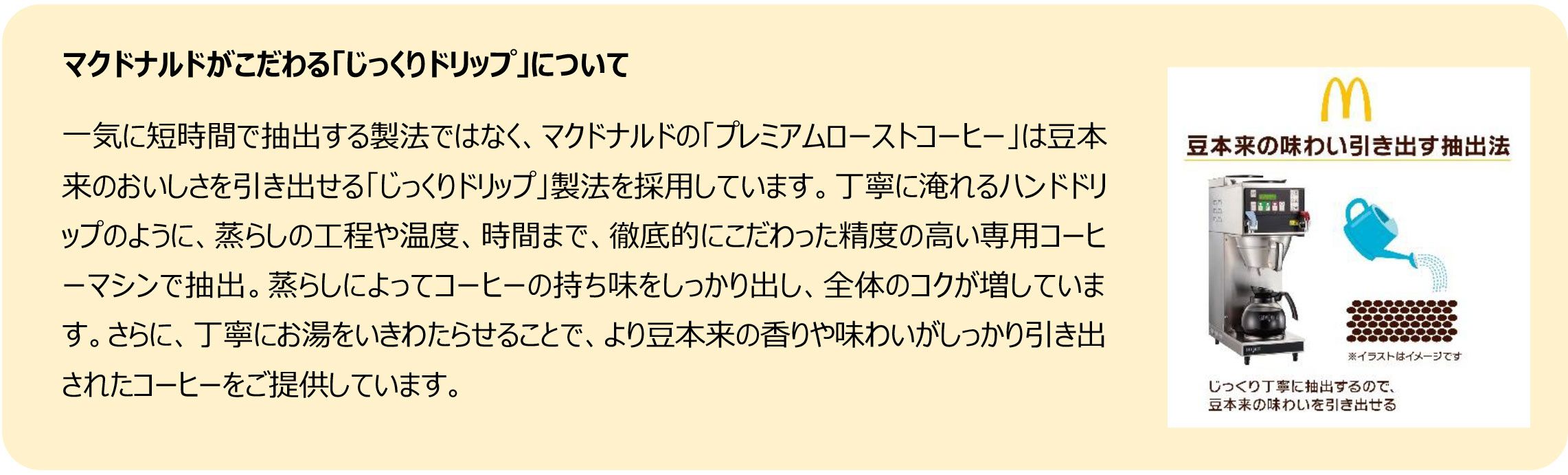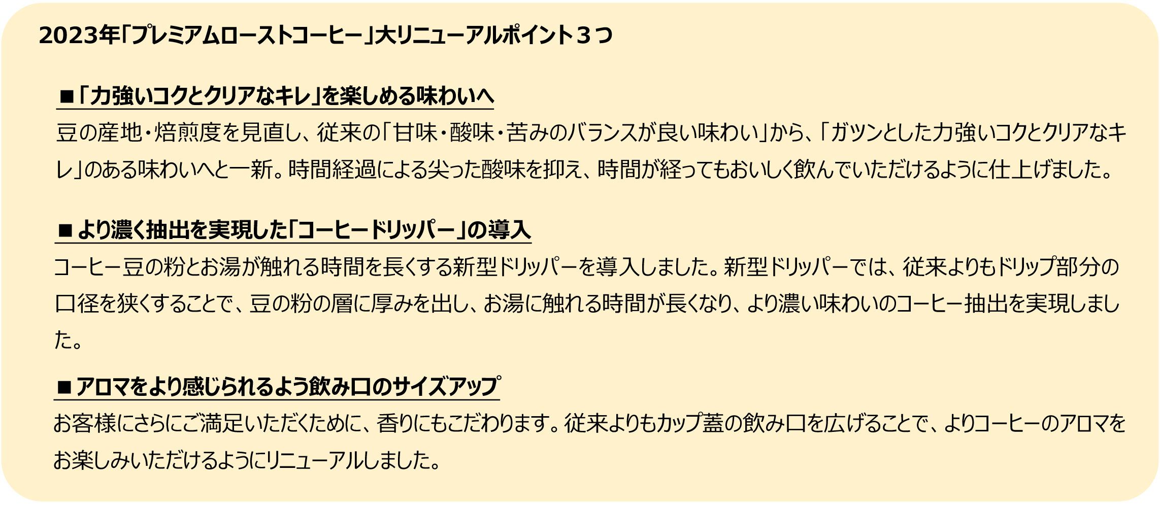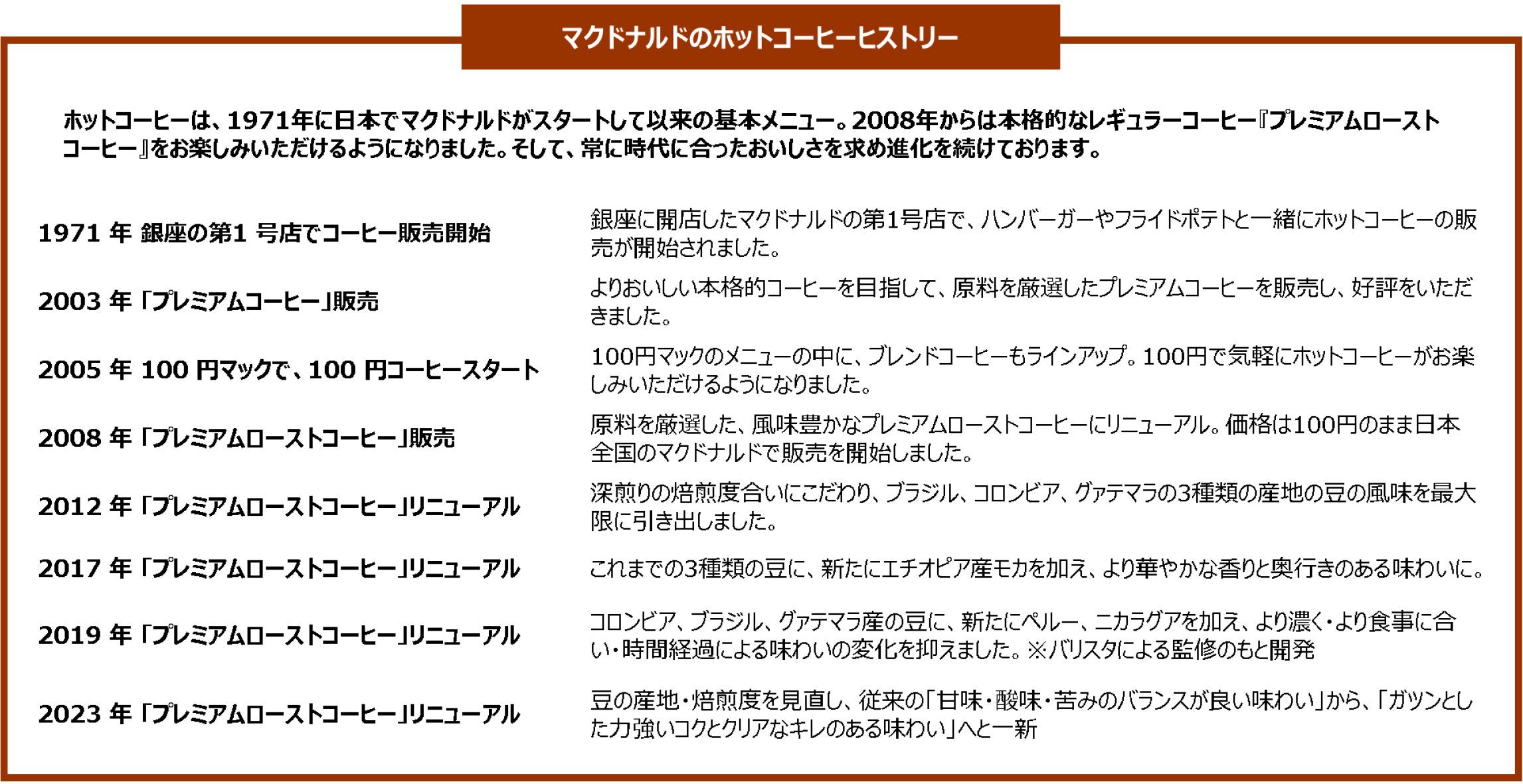 マクドナルドでは2023年より「本気カフェ宣言」を掲げ、「カフェラテ」や「キャラメルラテ」、フラッペ・スムージーなど、お客様においしく品質のよいカフェメニューをご提供するカフェブランド“McCafé®(マックカフェ®)”で、より多くのお客様にマクドナルドらしい気軽で自由なカフェ体験をお楽しみいただけるよう進化を続けております。マクドナルドのホットコーヒーは、1971年の日本マクドナルド創業当時より販売しており、お食事と一緒に、またコーヒーだけでも、どんなシーンでも気軽に召し上がっていただける大人気の主力商品で、お客様の嗜好が変化していく中、よりおいしいコーヒーをご提供できるように、リニューアルを重ねてまいりました。2023年1月、コーヒー豆選びから一新し、ガツンとしたコクとキレが味わえる「プレミアムローストコーヒー」へ約3年ぶりにリニューアルしました。「プレミアムローストコーヒー」は、お店で一滴ずつ丁寧に抽出する、「じっくり本気ドリップ」で提供している、マクドナルドの中でもいちばん手間をかけたメニューです。ガツンとした力強いコクがありながらもキレのある後味が楽しめるこだわりのコーヒーで、朝の1杯に、食後の1杯に、休憩の1杯にと様々なシーンでお楽しみいただいております。またスイーツの人気メニューであるフランス産の「マカロン」3種との相性もよく、おすすめの食べ合わせとなっております。お気軽に本格的な味わいをお楽しみください。
