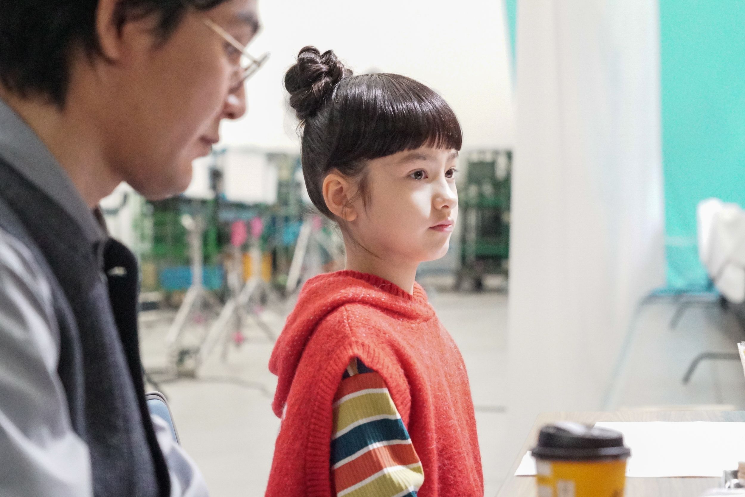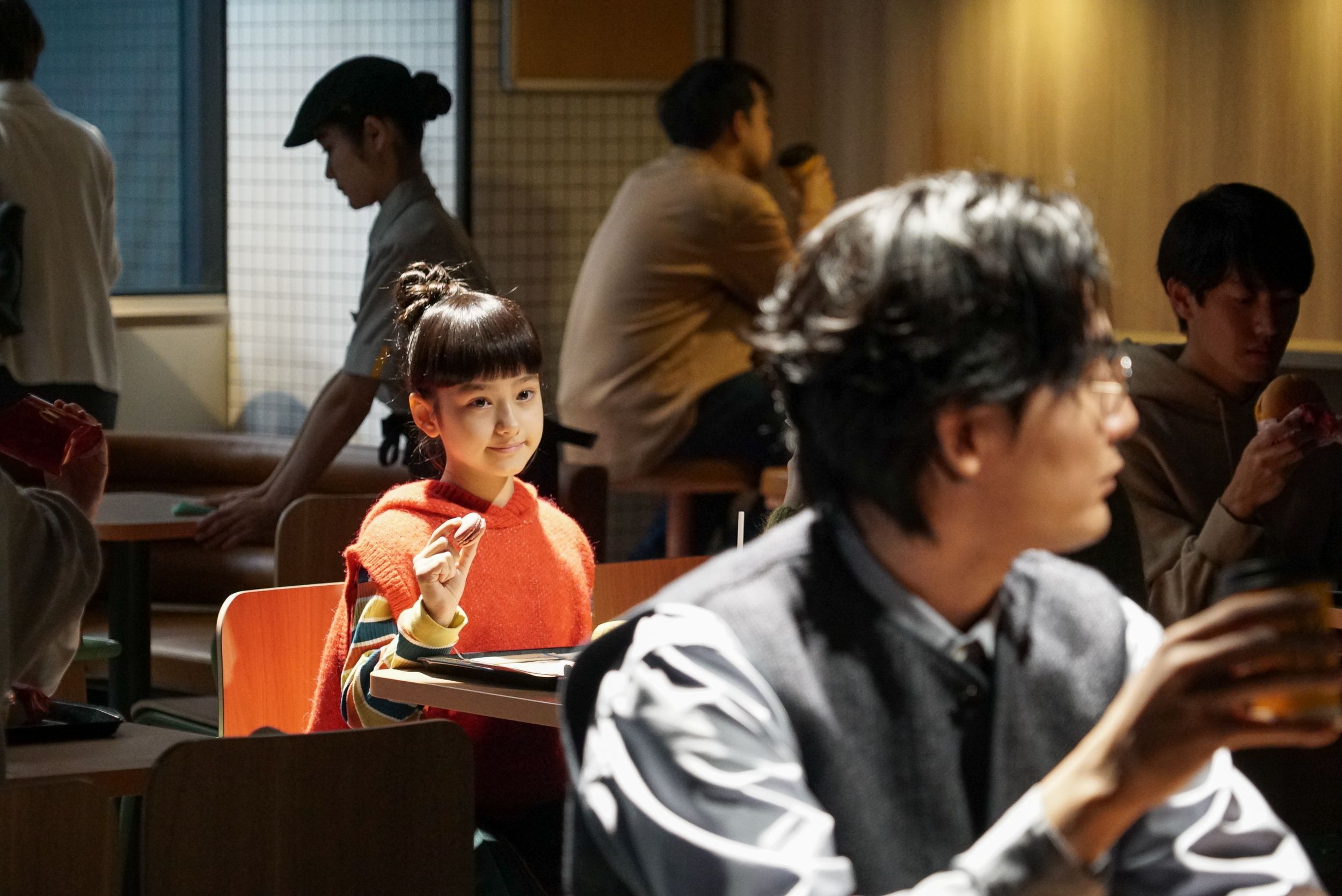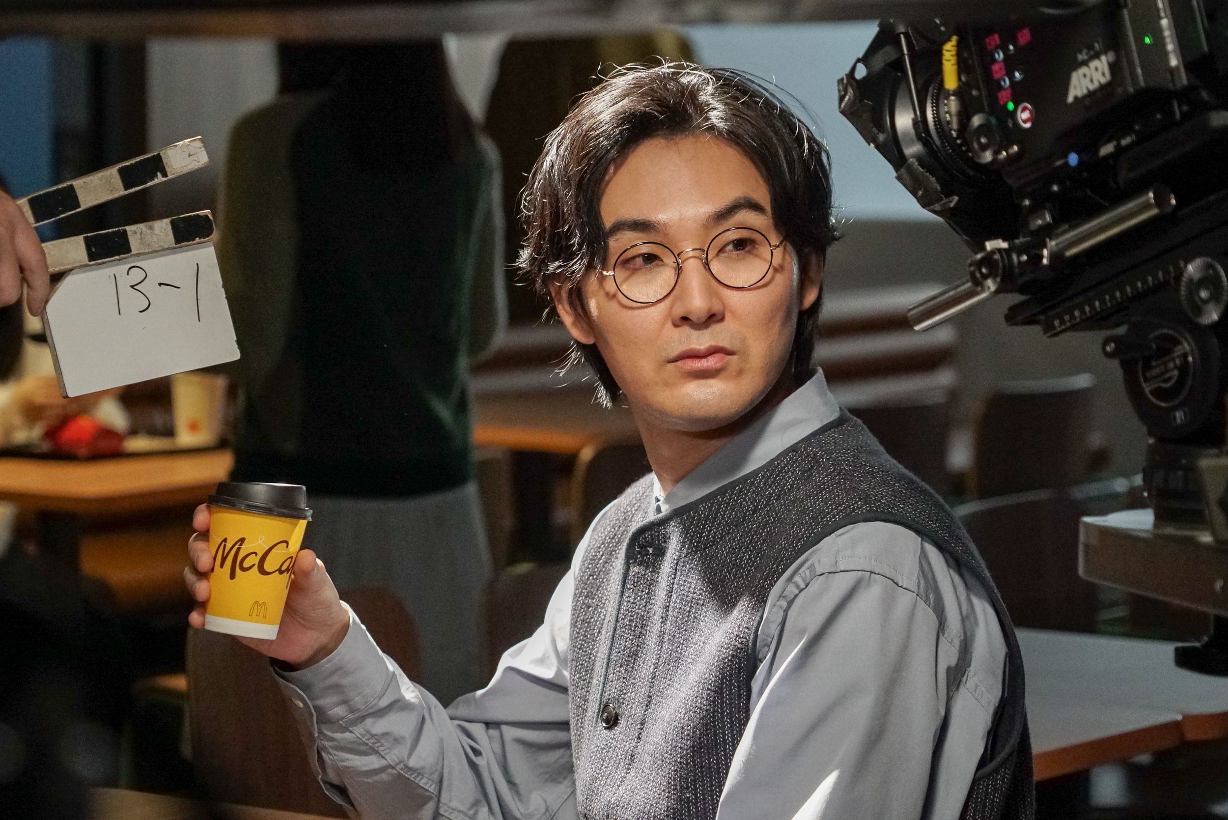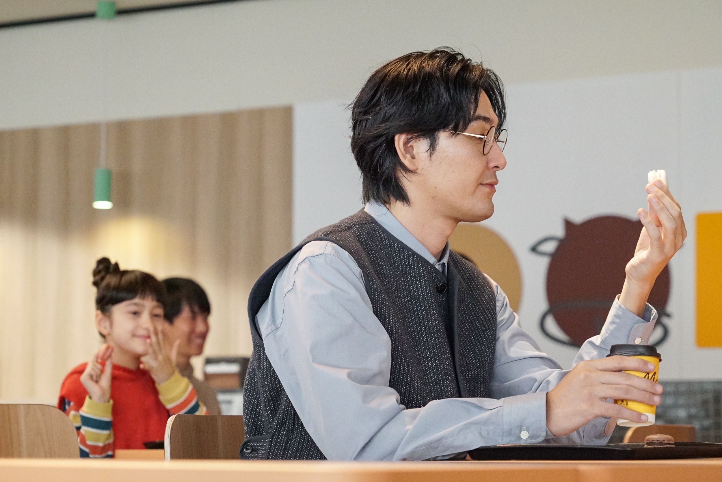 この日最後の撮影は、マカロンやコーヒーの豆知識を教えてくれた少女に“お礼のリアクション”を披露するシーン。クールながらもユーモラスな一面を持つ主人公を微妙な表情の変化で表現してきた松田さんですが、ラストシーンでは2つのマカロンをメガネに重ねて振り返るコミカルなアクションを披露しました。「まさか」と目を疑う面白さ満点の演技にスタッフが笑いを堪える中、松田さんはマカロンがベストな位置に決まるよう真剣な表情で挑戦を続けましたが、OKテイクを獲得し映像を確認すると、フフッと安堵の笑みを浮かべました。