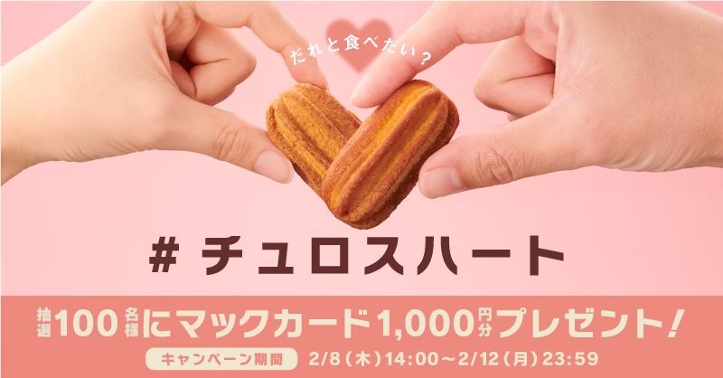 「#チュロスハート」のハッシュタグをつけて、「#チュロスハート」のハッシュタグがついた投稿(以下「キャンペーン対象ポスト」といいます。期間中3回投稿)にリプライ(返信)すると、抽選で100名様にマックカード1,000円分が当たります。