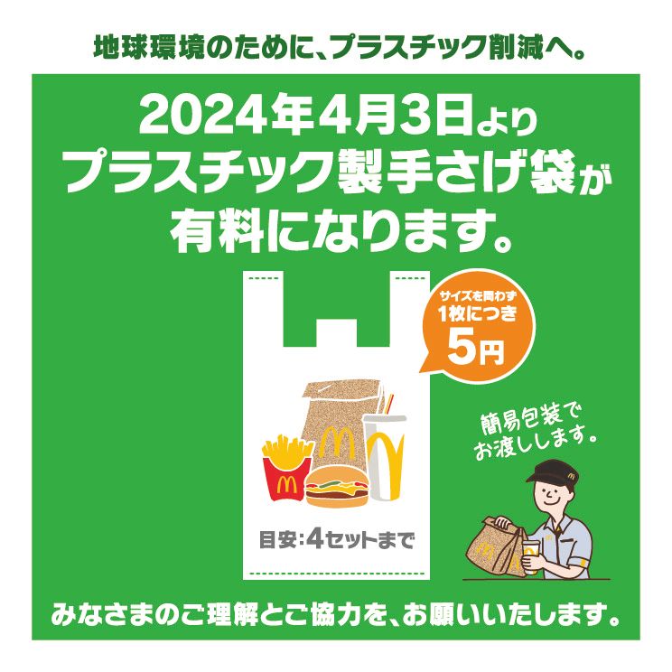 また、お客様提供用パッケージについて、再生可能素材、リサイクル素材、認証素材への移行を進めております。2024年は、4月よりプラスチック製手さげ袋を有料化(サイズ問わず1枚につき税込5円)を長崎県内全店舗(佐世保基地店を除く23店舗)にて、マックフルーリー®の新パッケージの導入を埼玉県の23店舗にて行います。プラスチックの削減をさらに推進するとともに、店舗をご利用されるお客様のご意見や店舗オペレーションを検証し、全国の店舗への拡大を検討してまいります。さらに、紙カップを店舗にて回収し、リサイクルするテストも東京都の一部店舗にて実施いたします。