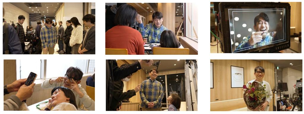 現場入りでは、共演する子役の元気な挨拶につられて「おねがいちます」と言ってしまう飯尾さんのお茶目な一面が垣間見られ、一瞬にして現場の空気が和やかな雰囲気に包まれました。打ち合わせでスタッフから撮影で使用する曇っためがねを渡され、興味津々な表情を浮かべる飯尾さん。監督に自ら「(めがねを)拭いちゃってもいいですか?」と提案し、見事「めがねワイパー」のアクションが採用されました。娘を笑わせるシーンの本番では、思っていたよりも静寂の時間が流れてしまい・・・「笑わないなあ。笑わないじゃないか!(笑)」と自ら突っ込みを入れる様子に、現場が笑いの渦に包まれました。その後も娘役の子役を笑わせるためにアドリブを炸裂し、スタッフからも称賛の声が上がっていました。撮影の合間には、飯尾さんが子役に「ワイパーとは何か」を説明するやり取りも見られ、本物の親子かのように談笑する様子が印象的でした。飯尾さんの持ち前の明るさとユーモアが存分に発揮された現場となりました。