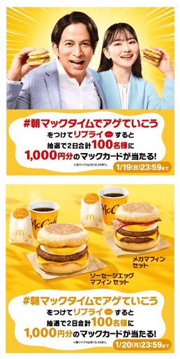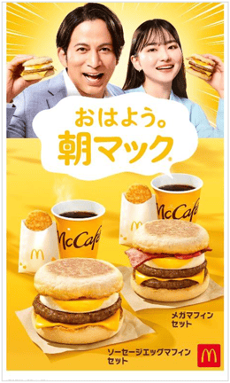 日本マクドナルド株式会社(本社:東京都新宿区、代表取締役社長兼CEO:トーマス・コウ)は、「ソーセージエッグマフィン」や「メガマフィン」「ハッシュポテト」など、できたてであたたかい朝食をお楽しみいただける「朝マック」を、朝10時半までのモーニングメニューとしてご提供しています。そんな朝マックから、ピンチな時こそ「朝マックタイム」に変えて“朝からアゲていこう”とお伝えする、岡田准一さんと山田杏奈さん出演の新年初のTVCMを、1月19日(日)より放映いたします。