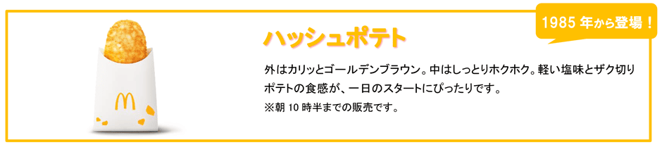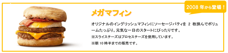 マクドナルドでは、一日を通して様々な商品をお楽しみいただけるよう、時間帯で異なるメニューをご提供しており、朝10時半までの時間帯では「朝マック」として、「ソーセージエッグマフィン」や「エッグマックマフィン」、たっぷりのシロップとバターがしみ込んだおいしさが特長の「ホットケーキ」や、人気のサイドメニュー「ハッシュポテト」などをご提供しております。バーガー類は単品でのご提供のほか、ドリンクとサイドメニューを組み合わせた「バリューセット®」や、ドリンクと組み合わせた「コンビ」と、お得なセットメニューも大変ご好評いただいております。また、ソーセージパティを2枚挟んだボリュームたっぷりな「メガマフィン」などの大満足な朝食メニューもご用意しており、できたてのあたたかさだけでなく、お客様のニーズに合った朝食をお楽しみいただけるよう、豊富なメニューを取り揃えております。