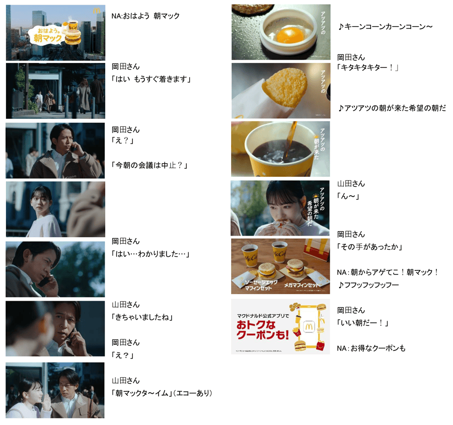 そんな「朝マック」の魅力をお伝えする新年初のTVCMでは、今年も岡田准一さんと山田杏奈さんが出演し、本作で3度目の共演となります。朝から会議に向かっていた2人、急遽中止を告げる電話が入った岡田さんに、山田さんが嬉しそうに「朝マックタ~イム」とささやきます。それを聞いた岡田さんの頭の中にも“ラジオ体操の歌”の替え歌が響き、「キタキタキター!」と歓喜。ピンチの朝を逆にチャンスに変えるアツアツの朝マックに、「その手があったか」と大満足するお2人の姿を、ぜひご注目ください。また、Xキャンペーンなど各種施策もご用意しておりますので、あわせてお楽しみください。(詳細は下記を参照)
