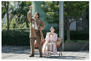 ◇岡田さんの雄叫びが朝の街に響く・・パワフルな演技に山田さんも思わず笑顔!
