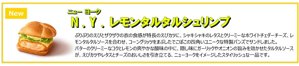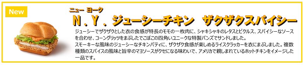 「行った気にさせるよ!N.Y. バーガーズ」は、2022年、2023年に大変ご好評をいただきました、特製の四角いバンズを使用した見た目にもスタイリッシュなニューヨークをイメージしたバーガーシリーズで、今年はさらにパワーアップし、4種類の新しい味わいで登場します。「N.Y. バーベキュー 肉厚ビーフ&チーズ」は、肉厚100%ビーフパティに、バーベキューフィリングとマイルドなマスタードソース、さらにチーズを合わせた食べ応えのある一品です。「N.Y. ジューシーチキン ザクザクスパイシー」は、モモの一枚肉をライスクラッカーを使用したザクザク衣で包んだ食感も楽しめるジューシーなチキンと、スパイシーなソースの味わいが絶妙なホットチキンをイメージした一品です。そして「N.Y. レモンタルタルシュリンプ」は、ぷりぷりのえびカツとレモンで爽やかに仕上げたタルタルソースを合わせ、ニューヨークをイメージしたスタイリッシュな一品となっております。今年は初めて朝マック限定で「N.Y. バーベキュー ソーセージ&チーズマフィン」も登場します。ぜひ、新商品のバーガー4種を、まるでニューヨークに行った気分で、朝から晩まで楽しく味わっていただければと存じます。