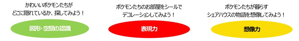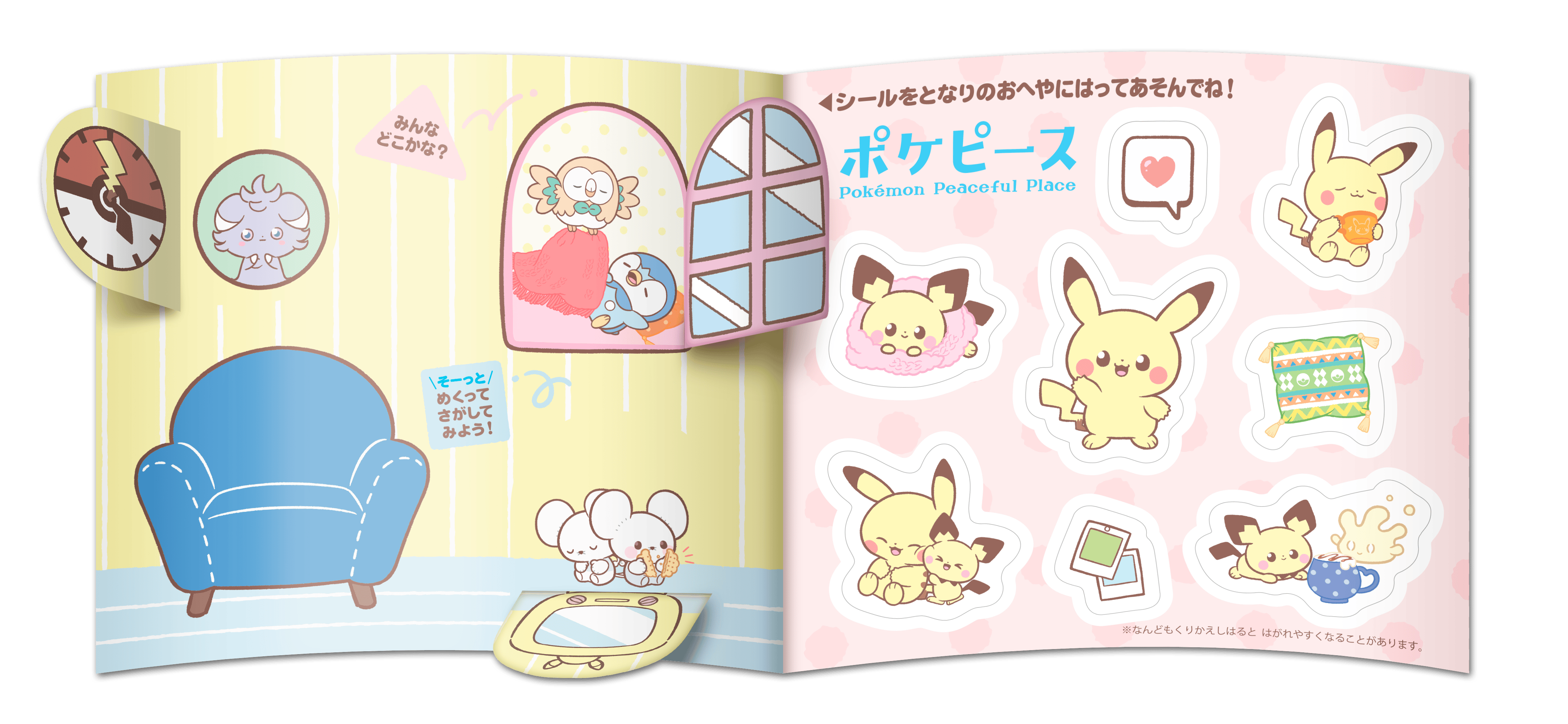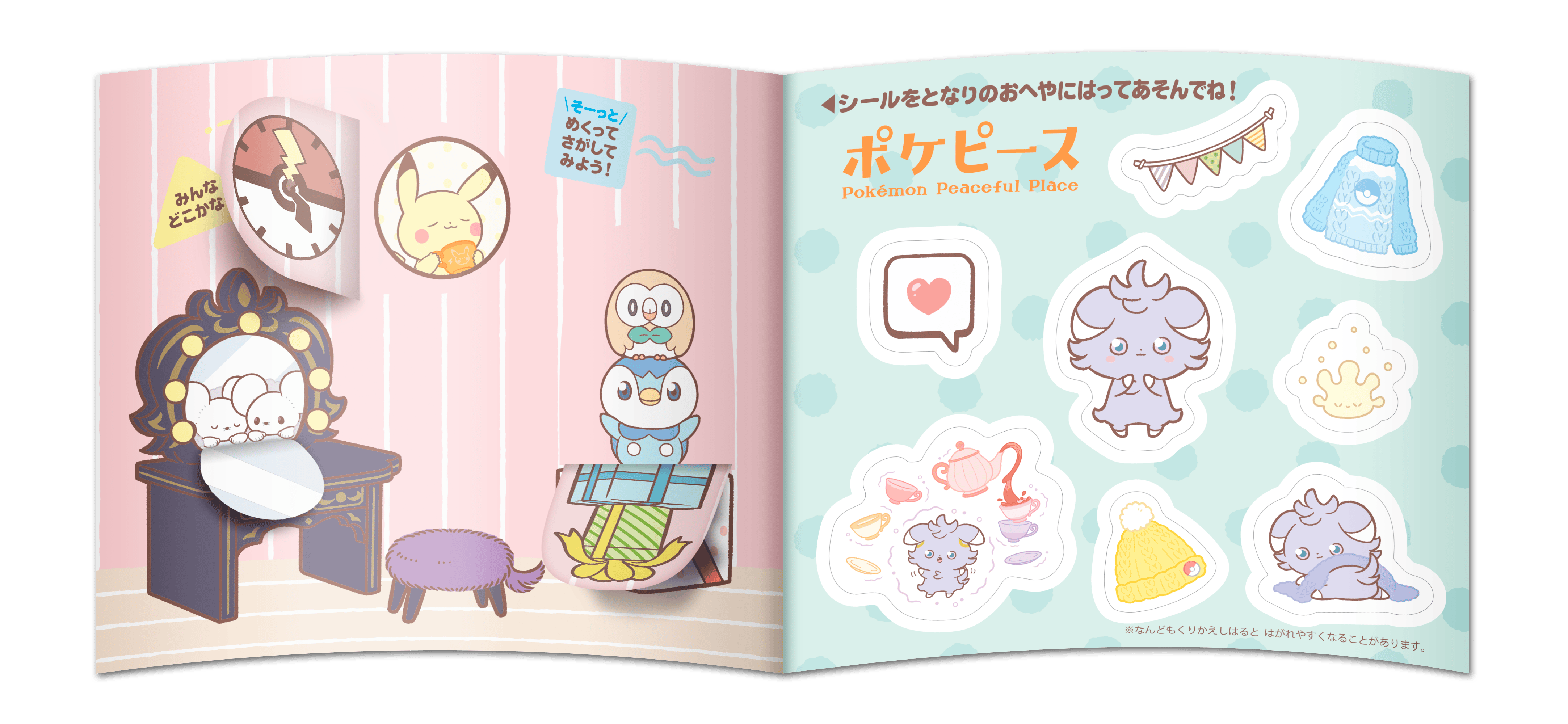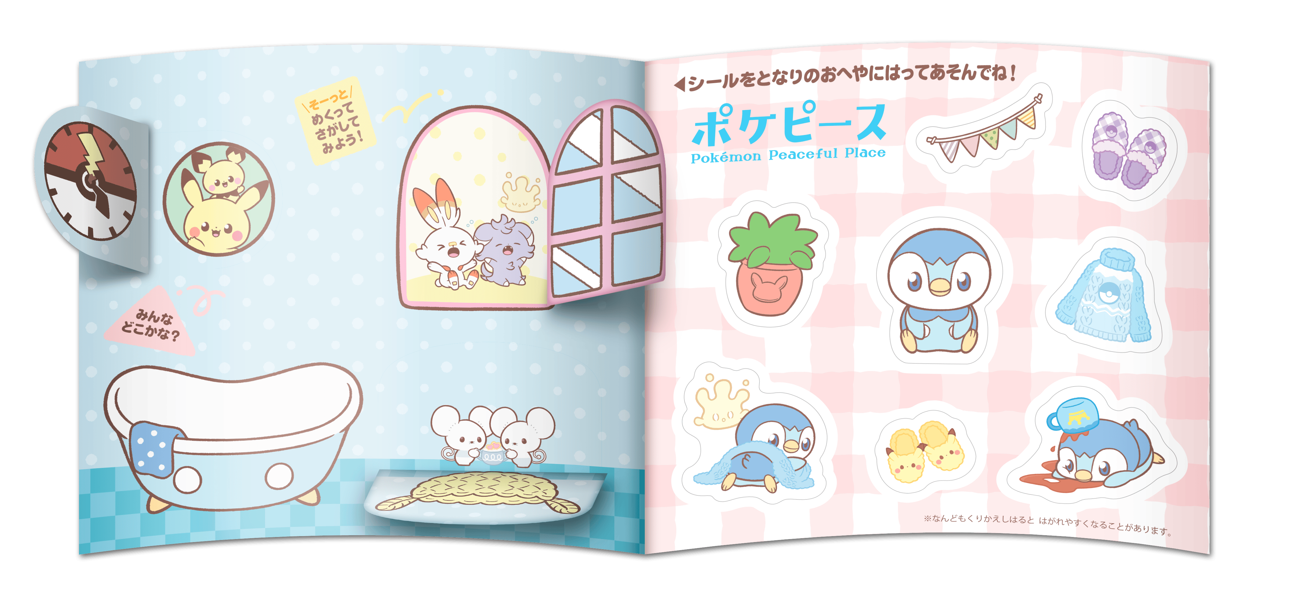 大バトルするポケモンがいる一方、「ポケピース」のように、優しい色づかいのシェアハウスで、のんびりと自由きままに暮らすポケモンたちもいます。「ピカチュウとピチューは、リビングルームで、どんなおしゃべりをするのかな?」「おしゃれなニャスパーは、朝起きたら何をすると思う?」と、会話をしながら、ポケピースのなかまたちのいる部屋にポケモンや道具のシールを貼って遊びましょう。ドールハウスで「おうちごっこ遊び」をするように、ポケピースの世界が想像の中で動き出し、「自由なくらしの物語」をふくらませる遊びになるはずです。