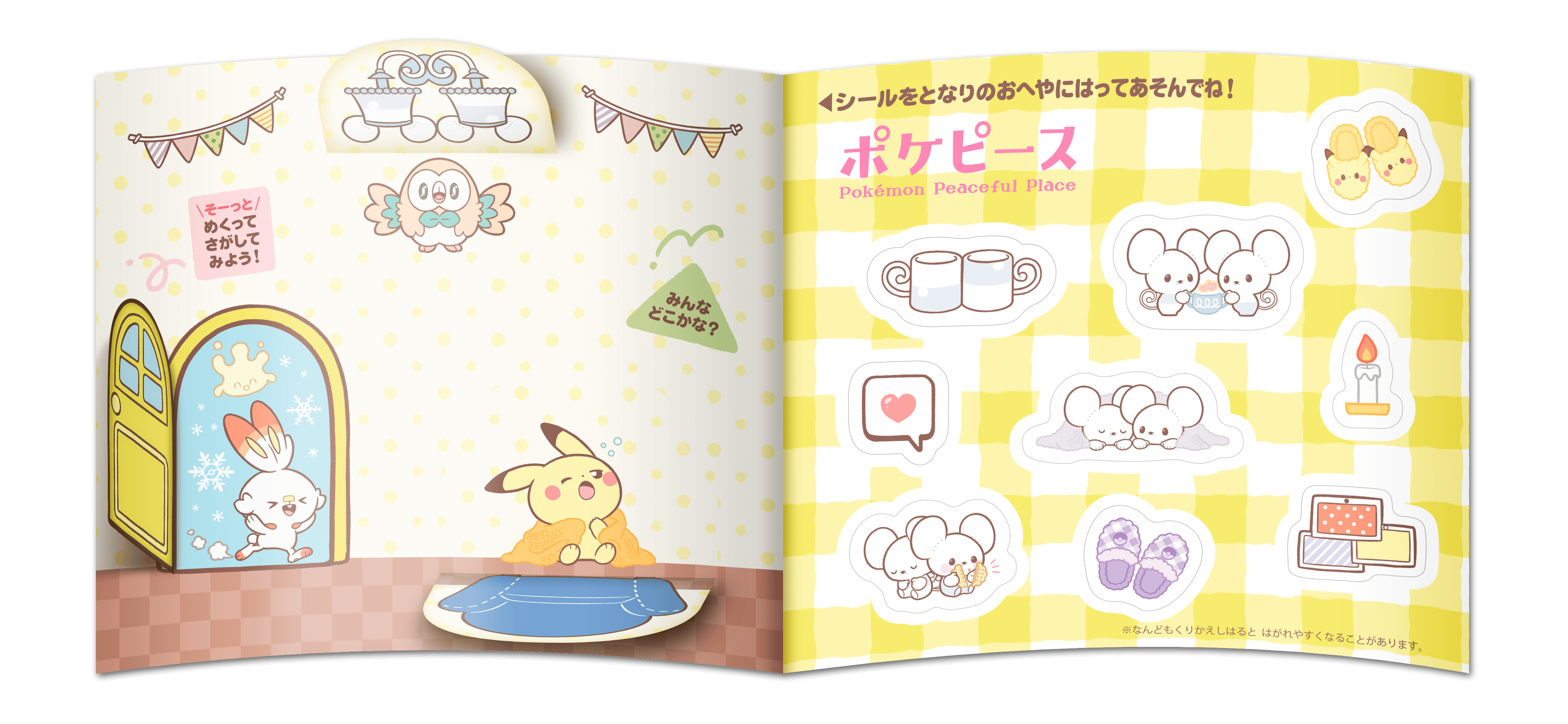 「ピカチュウとピチュー」「ポッチャマ」「ヒバニー」「モクロー」「ニャスパー」「ワッカネズミ」のいるお部屋にシールを貼ったり、隠れているポケモンたちを探したりして遊べる、シール&さがしあそびのマクドナルドオリジナルブックです。