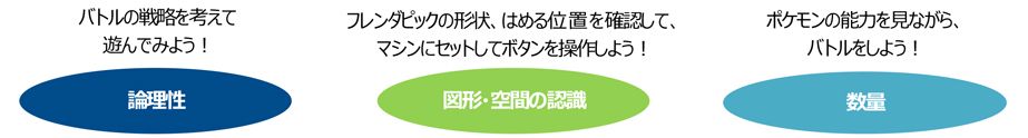 ハッピーセット「ポケモンフレンダ」は、フレンダピックを使って、ポケモンとバトルしたり、捕まえたりして遊べるアミューズメントゲーム機「ポケモンフレンダ」とハッピーセットのキャンペーンで、ラインアップはピカチュウと伝説のポケモンたちのマクドナルドオリジナルスペシャルフレンダピック全6種です。フレンダピックに書かれている「ポケエネ」「わざ」「タイプ」などの数値や特性をもとに、勝つための戦略を考えて遊びます。また、ゲームの機械にフレンダピックをはめてボタンを操作したり、変化する画面をタッチしたりする遊びは空間認識を高めます。手持ちのフレンダピックで「どのポケモンを、どう組み合わせれば勝てるか?」と、ポケモンの能力をもとに論理的にバトルの作戦を考える遊びができます。付属のカードに書かれた穴埋め文字クイズもあわせてお楽しみください。