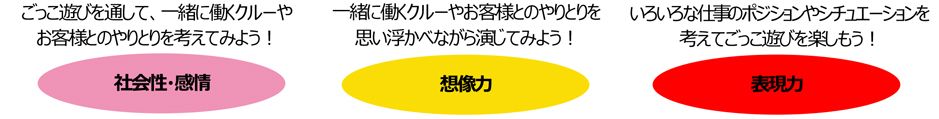 「マクドナルドでは、お客さまとクルーが、どんなやりとりをして、注文からお食事へとスイスイ進んでゆくのか?」、「クルーは、会計をしたり、次々に調理や包装をしたりして、どんな手順で働いているのか?」ということに好奇心を持って、子どもは仕事を観察しています。また、「笑顔であいさつをする態度」、「丁寧な言葉のやりとり」といった、社会的スキルも読み取っています。「なりきりマクドナルド」のおもちゃは、学んだ手順や態度を、実際に演じる舞台を与えてくれるのです。おうちの方もお客さまを演じて、いろいろな注文をしてみましょう。