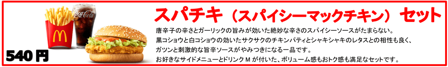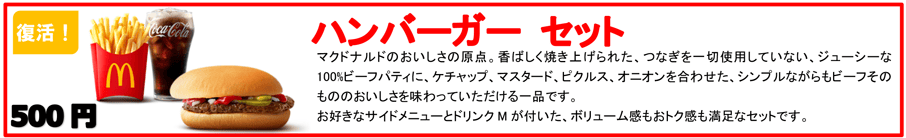 ボリューム感がありながらおトクなバーガー「マックチキン®」「スパチキ」、「チキチ―®」、「エグチ」に、選べるサイドメニューとドリンクMがついて、いつでも500円台で楽しめるセットは、『ちょいセット®』として大変多くのお客様にご好評いただいてまいりました。この度、「ハンバーガー」のセットが10年ぶりの復活を果たし500円で加わることで、「マックチキン」と合わせて500円ぴったりで楽しめるセットが2種類に増え、他の500円台のセット3種類と合わせて合計5種類の「セット500」のラインアップに進化しました。そして500円台で楽しめるおトクなセットとしてより親しんでいただけるよう、新しい名称『セット500』に生まれ変わります。ボリューム感がありながら500円台で楽しめる豊富なラインアップに進化した『セット500』を、ぜひお楽しみください。