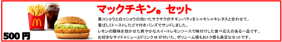 | マックチキン® | 190円~ | 500円 | レギュラー販売中 | |