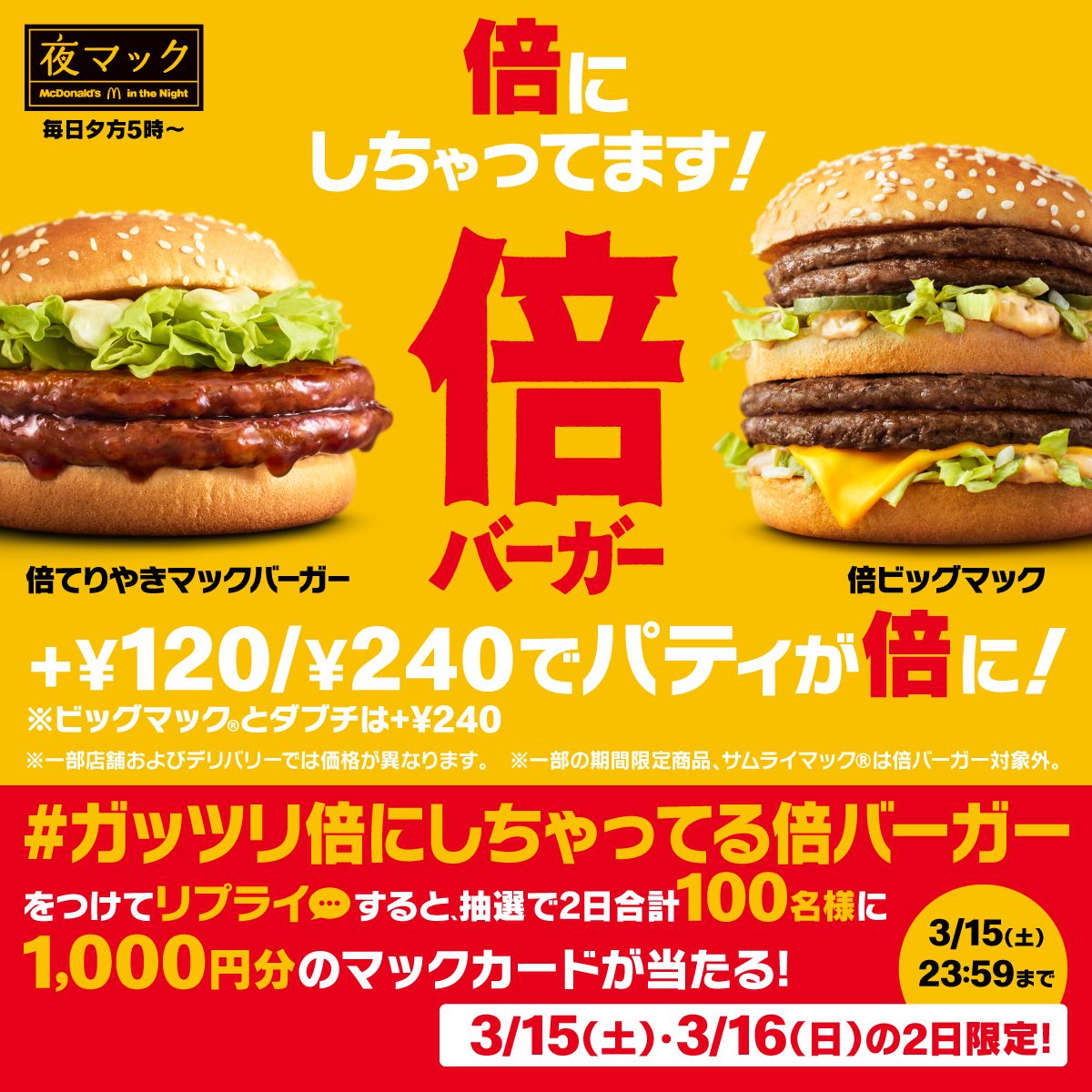 2024年の人気ランキングは倍ダブルチーズバーガー、倍ビッグマック、倍てりやきマックバーガー(2023年1月1日~2024年1月31日の販売実績の集計より算出)の順であることを発表しましたが、3月17日(月)10:00~3月18日(火)9:59までの予定で、マクドナルド公式Xにて、好きな倍バーガーをお伺いいたします。