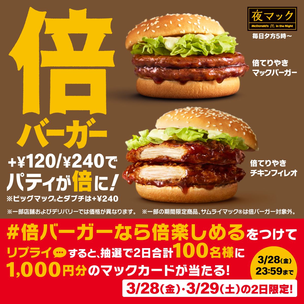 「夜マック」は、しっかりとお食事をとりたいというニーズがあるディナー時間帯でもご満足いただけるボリューム感とおいしさをご提供するため、2018年3月より、毎日夕方5時からのディナー時間帯限定でご提供しているメニューです。「倍バーガー」は、レギュラーメニューのバーガー(サムライマック®と一部の期間限定商品を除く)を対象に、+120円/240円していただくことでパティが倍になるメニューです。販売開始から今年で7周年を迎え、累計販売数は1.8億食を突破※しております。年々人気が高まっており、昨年は年間3,000万食超えとなり、“満足感のあるディナー”として大変ご好評いただいております。また、新TVCMを記念して、マクドナルド公式Xで“どの倍バーガーが好き?”という人気投票を実施いたします。昨年発表の販売実績での人気ランキングでは、倍ダブルチーズバーガーが1位でしたが、今年は…?お好みの倍バーガーとともに、Xでお声や盛り上がりも併せてお楽しみいただければと存じます。(詳細は下記を参照)