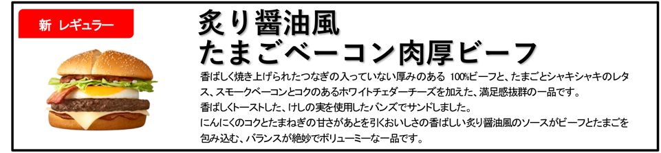 『サムライマック』は“大人が満足する”バーガーを目指して開発し、肉厚ビーフの新レギュラーメニューとしてお楽しみいただいている商品です。食にこだわりを持つ大人の皆さまに「これはまさに自分のための商品だ」と感じていただけるよう、ビーフのおいしさを堪能できる肉厚ビーフパティの食べ応えと、炙り醤油風ソースを組み合わせた、和の味わいをお楽しみいただける当社の自信作で、当初よりレギュラー販売している「炙り醤油風 ダブル肉厚ビーフ」に加え、「炙り醤油風 たまごベーコン肉厚ビーフ」が新レギュラー商品として登場いたします。「炙り醤油風 たまごベーコン肉厚ビーフ」は、厚みのある100%ビーフとたまごに、香ばしいソースが決め手の、ビーフとたまごのバランスが絶妙な一品です。なお、「炙り醤油風 たまごベーコン肉厚ビーフ」の販売開始に伴い、レギュラー販売を行っている「炙り醤油風 ベーコントマト肉厚ビーフ」は、3月25日(火)をもって終売いたします。