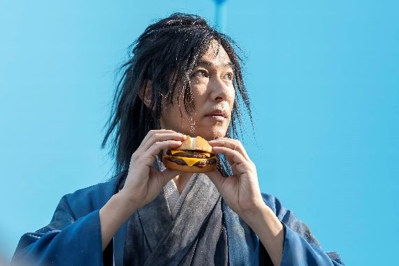 サムライ姿で「炙り醤油風 たまごベーコン肉厚ビーフ」を食べるシーン。ここではスーツ姿で食べるシーンと逆の構図で撮影すること(クレーンで降下していくカメラワーク)で、不安な自分から自信を持つ自分へ変化させていく雰囲気を演出しました。スーツ姿の食べカットでは、入念な打ち合わせと、本番での微調整を重ねた上で、完璧な演技を見せた堺さん。今回はその応用編とも言えるシーンでしたが、監督が思い描く理想の食べカットを即座に表現して、見事一発OKを獲得しました。