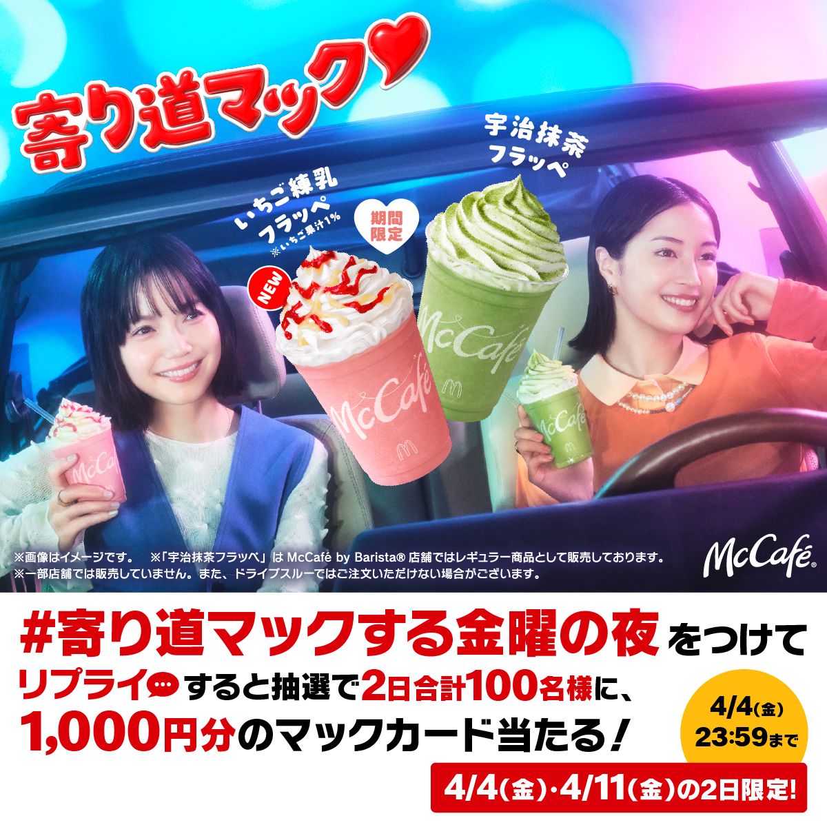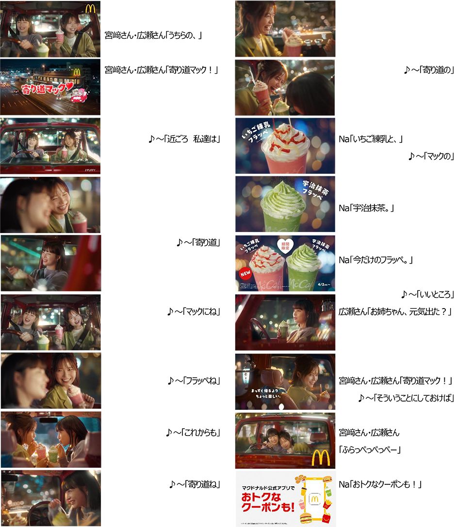 さらに、4月1日(火)から放映予定の新TVCMでは、McCafé®のアンバサダーを務めていただいている広瀬すずさんに加えて、宮﨑あおいさんが登場し、姉妹役としてMcCaféのCMで初共演いたします。PUFFYの名曲「これが私の生きる道」のご本人歌唱の替え歌に乗せ、“寄り道マック”して、期間限定の「いちご練乳フラッペ」と「宇治抹茶フラッペ」を夜のドライブで楽しむお二人にぜひご注目ください。また、Xキャンペーンなどもご用意しておりますので、あわせてお楽しみください。(詳細は下記を参照)