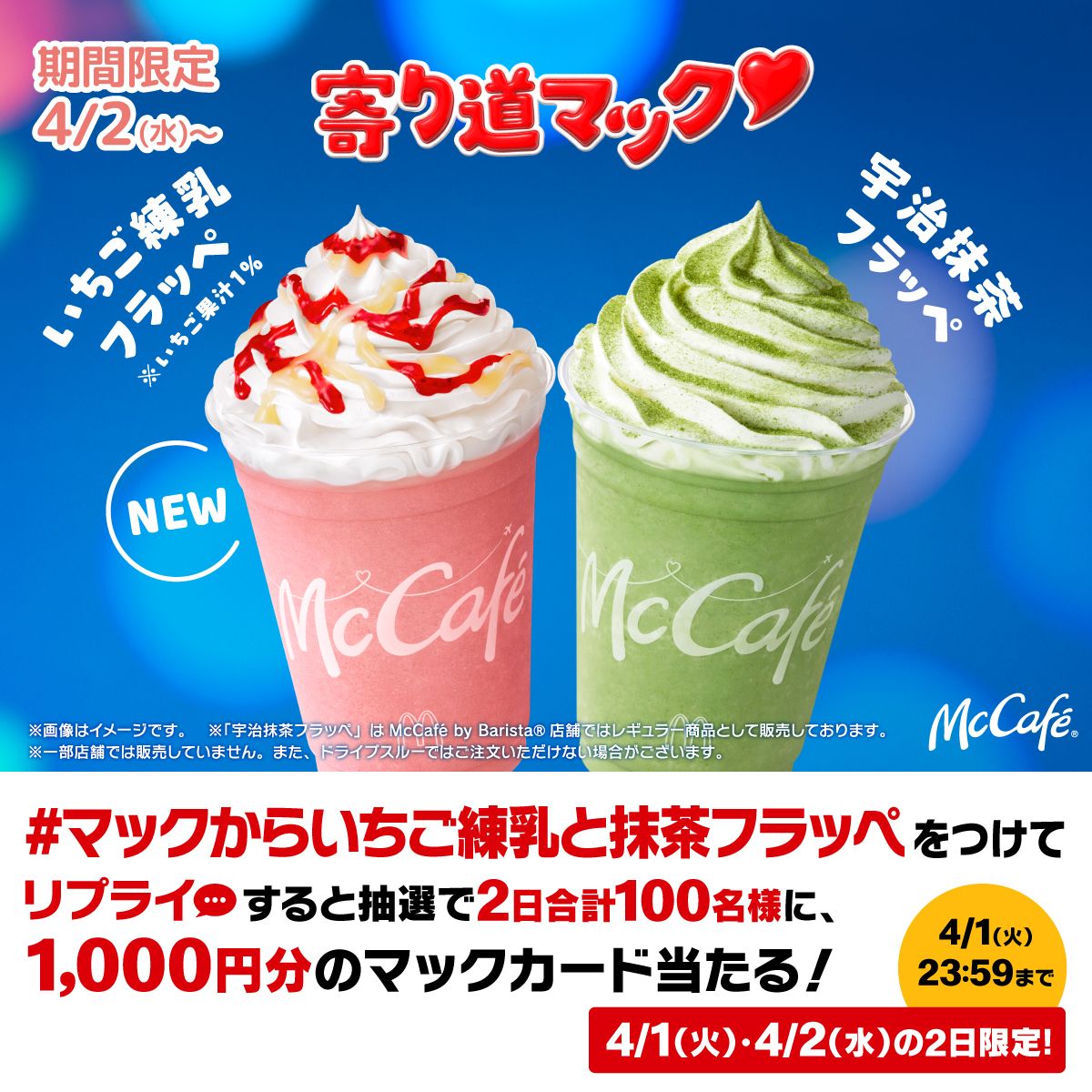 日本マクドナルド株式会社(本社:東京都新宿区、代表取締役社長兼CEO:トーマス・コウ)は、新しいキャンペーン“寄り道マック♡”を開始し、その第一弾として、見た目も味わいも春の季節にぴったりな「いちご練乳フラッペ」と「宇治抹茶フラッペ」(※)、「マカロン ピーチ&ピーチ」を、4月2日(水)より期間限定販売いたします。