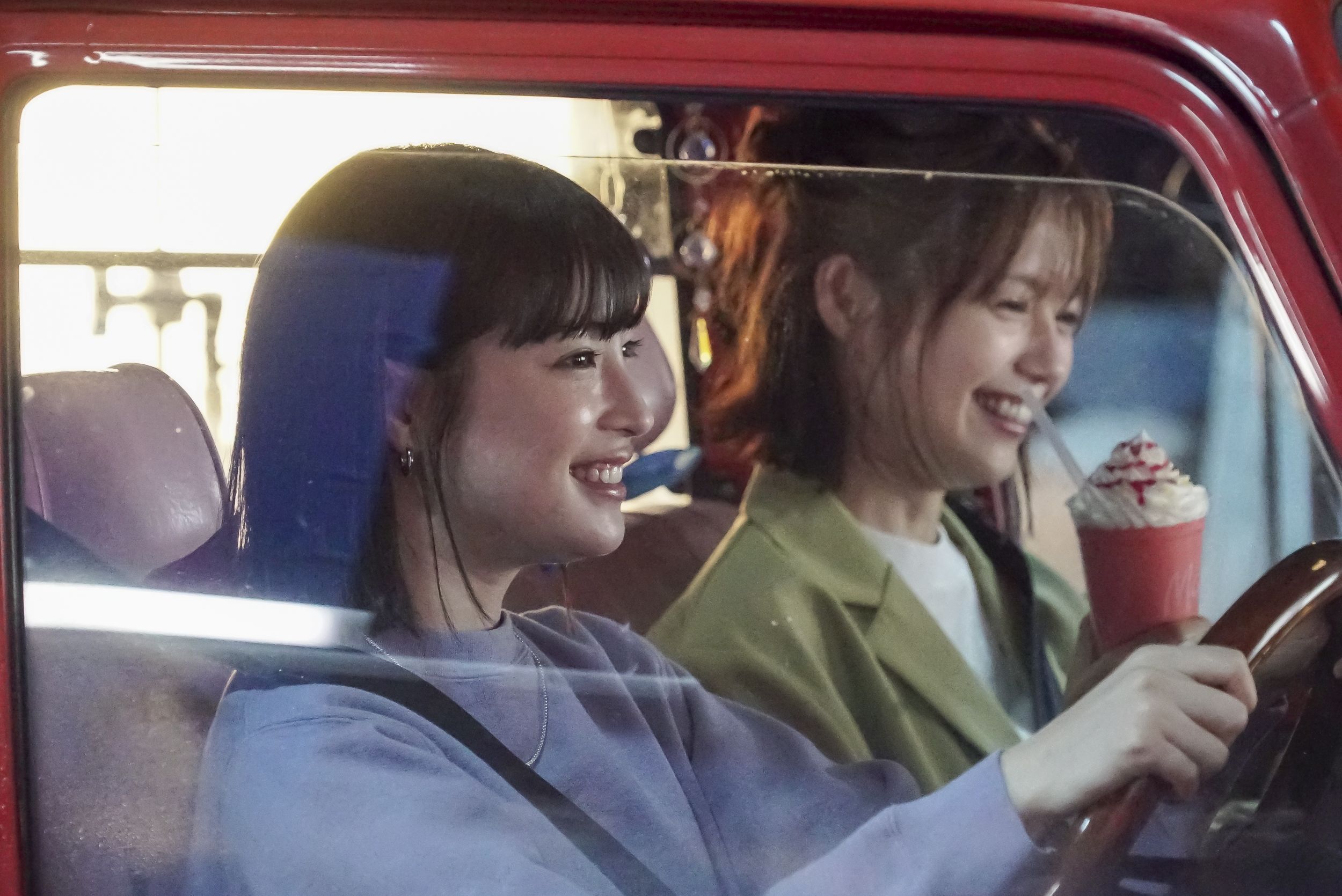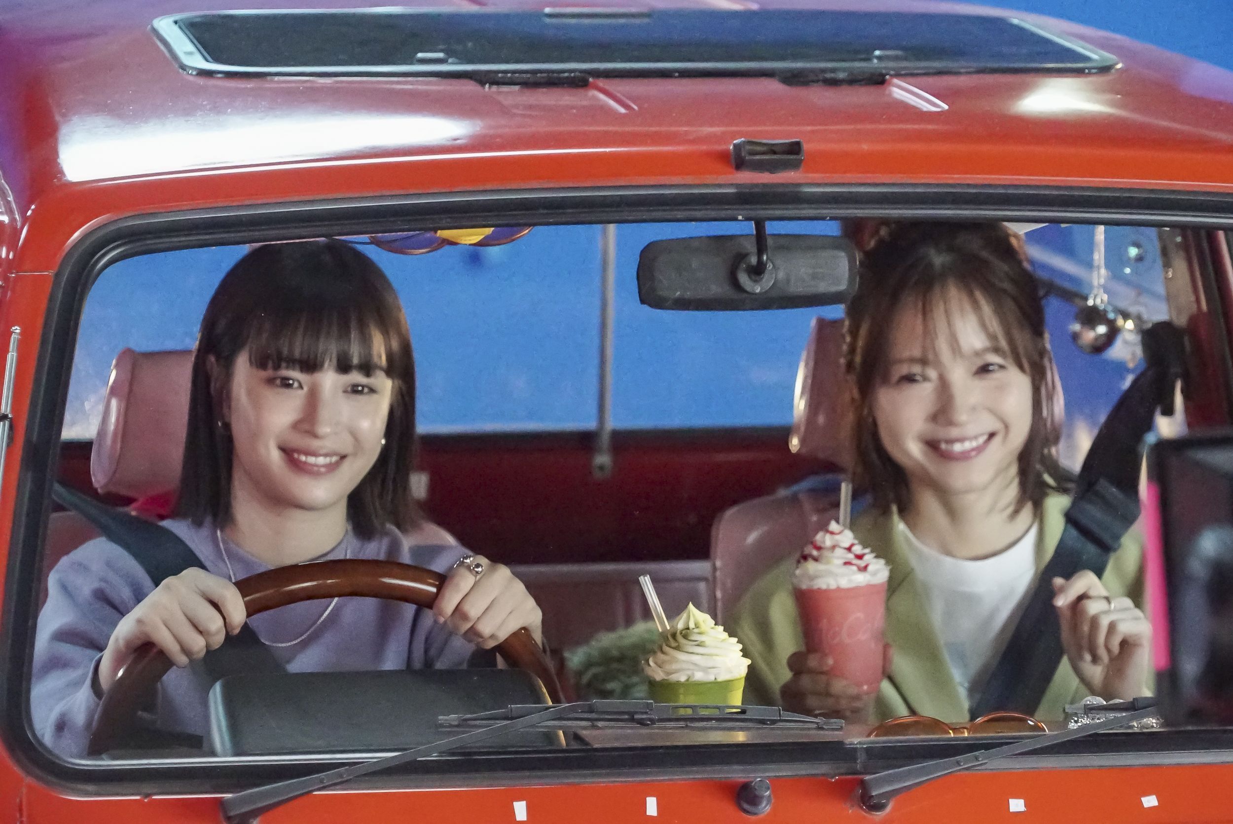 撮影が順調に進み“姉妹”として息もピッタリ合ってきた頃、宮﨑さんと広瀬さんはフラッペを飲むシーンに臨みました。宮﨑さんは甘酸っぱさが楽しめる『いちご練乳フラッペ』、広瀬さんは抹茶の芳醇な風味が感じられる『宇治抹茶フラッペ』を調理担当のスタッフから受け取り、ここでも仲のいい姉妹らしく動きをピッタリ合わせて、それぞれ手に持ったフラッペを味わいます。監督がOKの合図を出すと、宮﨑さんは「おいしい!シャリシャリした食感がいいね~」と『いちご練乳フラッペ』の感想をポツリ。広瀬さんも「おいしいですよね~」と『宇治抹茶フラッペ』を飲みながら、車の中でカフェタイムをエンジョイしていました。