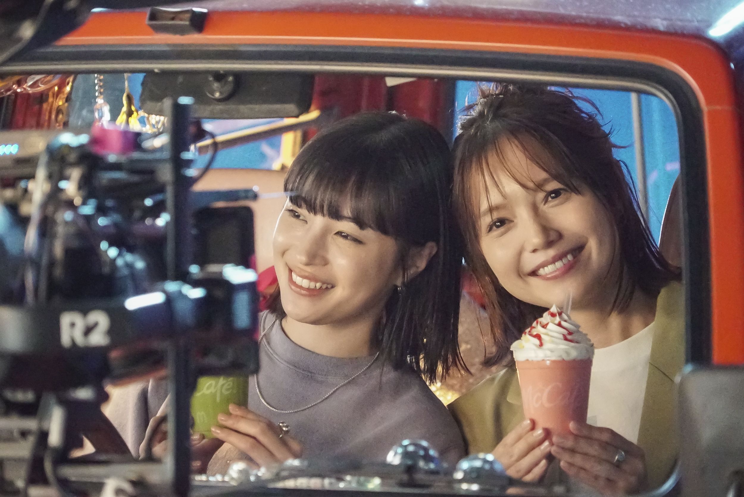楽しいドライブとカフェタイムの撮影を終え、いよいよ停車中の車内でのラストシーンの撮影が行われることに。子どもだった頃を思い出しながら「明日もお姉ちゃんと“寄り道マック”したい」という妹の気持ちと、そんな妹を愛おしく思っている姉の感情を表現したいと監督の説明を受けたふたりは、コクリと頷いて再び車の座席へ。カメラが回ると、宮﨑さんと広瀬さんはアドリブの演技を盛り込みながら姉妹愛たっぷりのコミュニケーションを披露。宮﨑さんが広瀬さんにギュッと顔を寄せると、その微笑ましい雰囲気に周囲のスタッフが「本当の家族みたい」と笑顔でつぶやく姿も見られ、無事にOKテイクを獲得するとスタジオが大きな拍手で包まれました。
