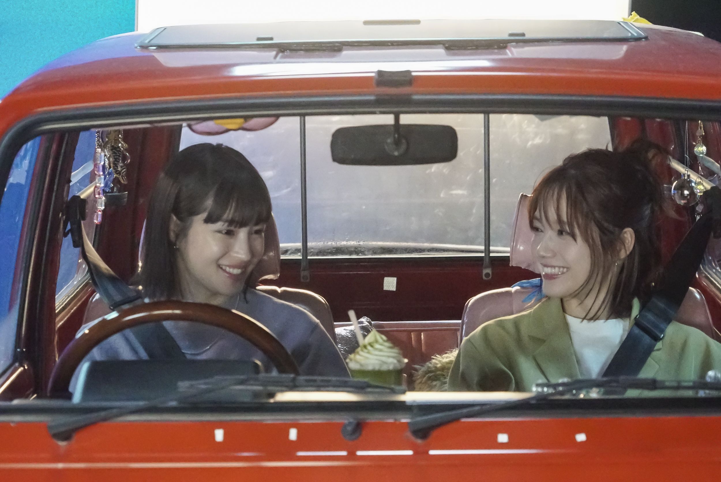 新TVCMは、自由奔放な性格の姉としっかり者の妹がふたりでドライブに出かけて“寄り道マック”をエンジョイするストーリー。ドライブシーンやフラッペを飲むシーンなど撮影は終始、車の中で行われました。撮影のために用意された車のコンパクトで角ばったデザインと愛らしい朱色のボディを眺めながら「かわいい~」とニッコリ笑い、身体をスッと滑り込ませるように運転席へ。バタンと軽い音を立てて閉まるドアや木製のハンドルなど、クラシカルな雰囲気を楽しみながら撮影の準備を整えていました。