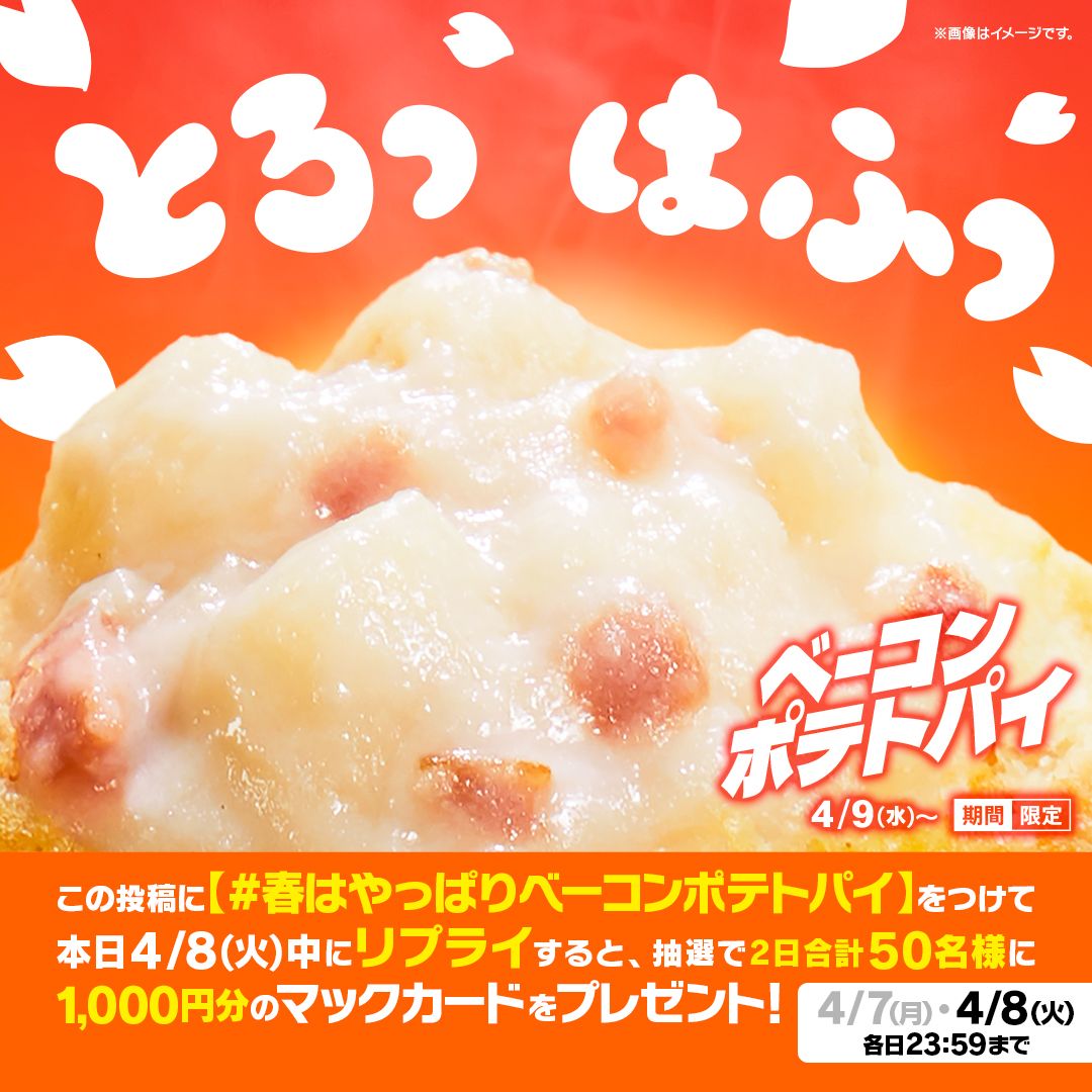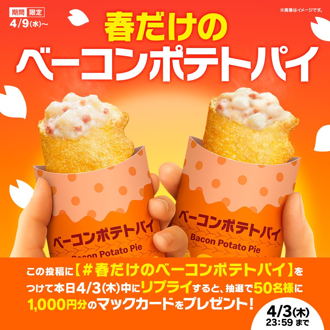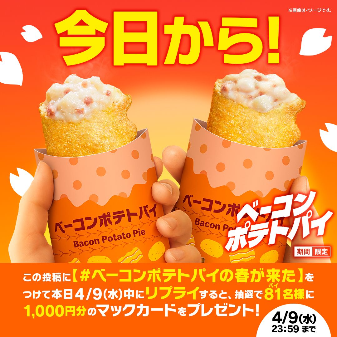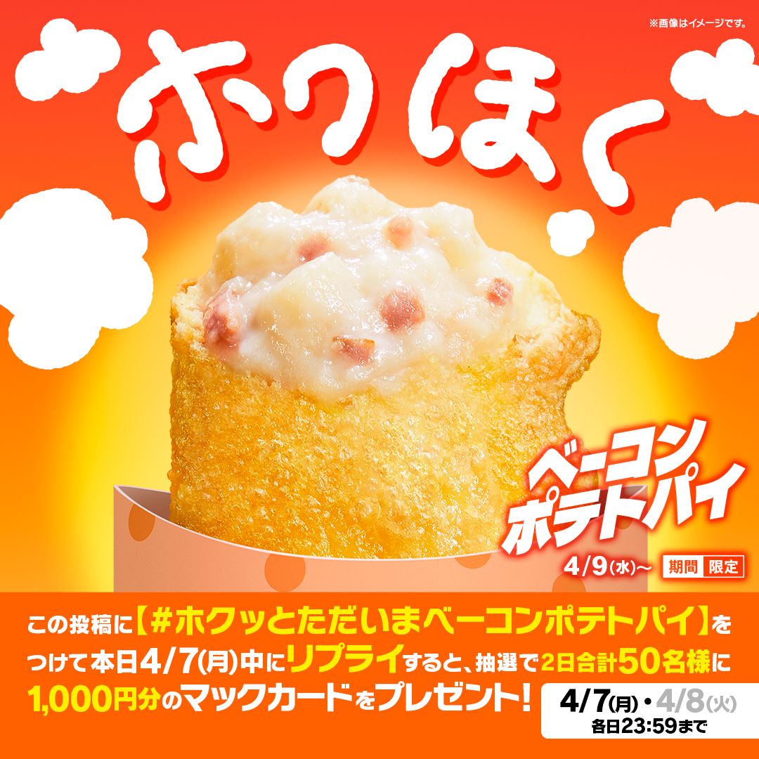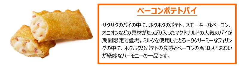 1990年に初登場し今年で35年が経った今もなお、販売するたびに多くのお客様にご好評いただいているマクドナルドの春の定番お食事パイ「ベーコンポテトパイ」は、ひと口食べれば、サクサクのパイ生地から溢れ出す、ホクホクのポテトにスモーキーなベーコン、オニオンなどの具材に、ミルクを使用したとろ〜りクリーミーなフィリングが絶妙なハーモニーの一品です。ほっと一息つきたい時、少し時間が空いた時、小腹がすいた時など、身も心もほっこりしていただける「ベーコンポテトパイ」を、新生活が始まる時期の気軽なお供としてお楽しみください。