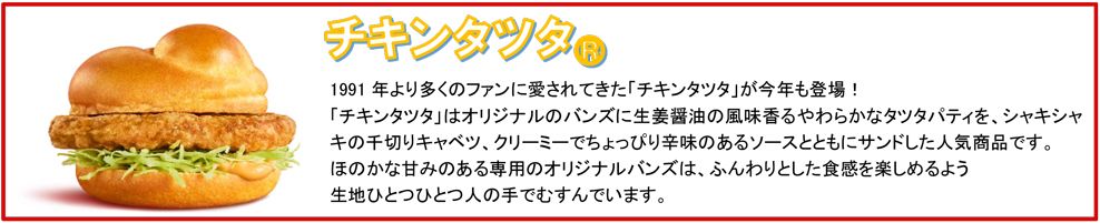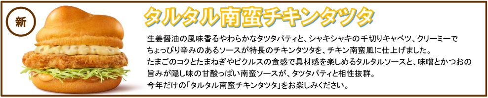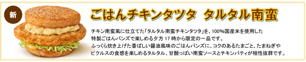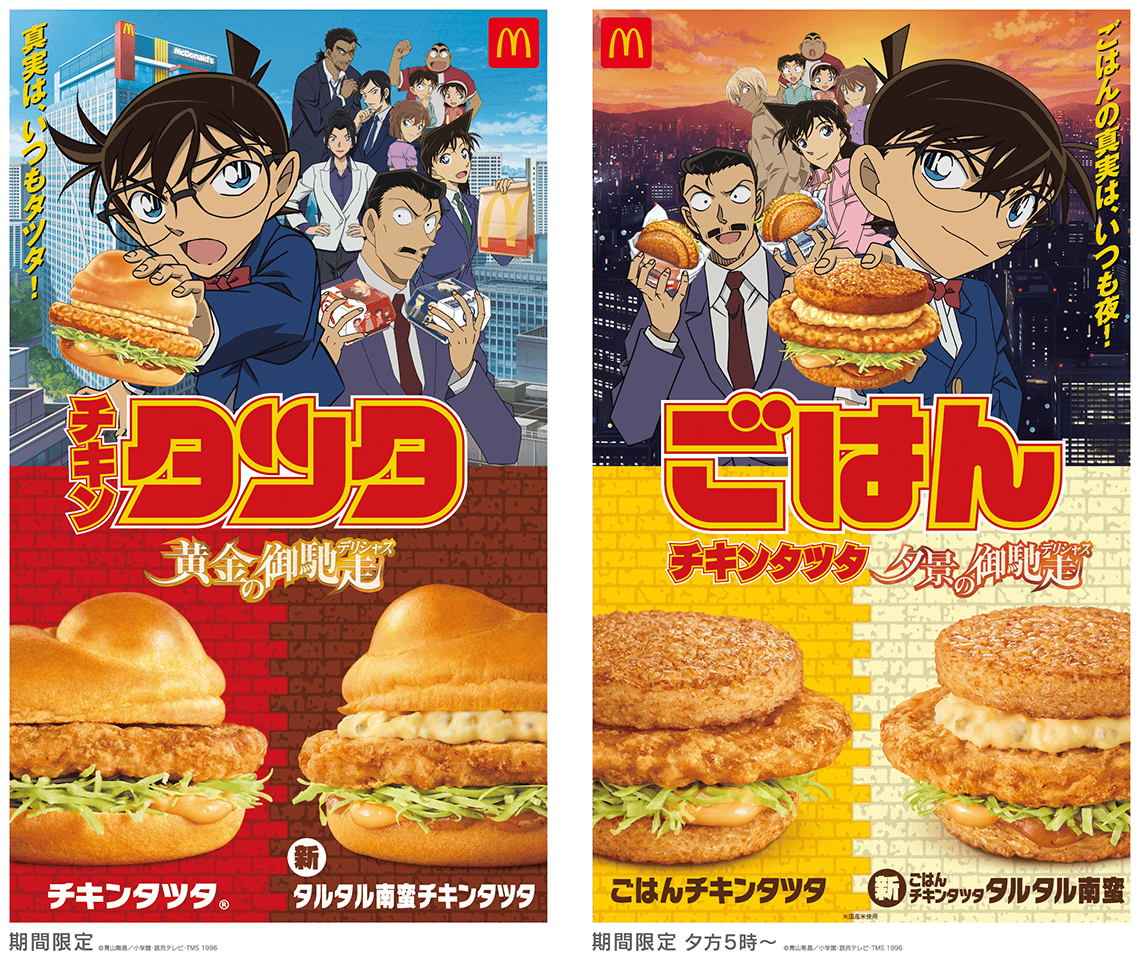 「チキンタツタ」は、1991年に初登場して以来、30年以上にわたってご愛顧いただいている人気の商品です。多くのファンの皆さまに愛される、“秘宝”ともいえる逸品です。今年も年に一度の“「チキンタツタ」シリーズ”をお楽しみいただきたいとの想いから、昨年初コラボで大好評いただいた大人気TVアニメの「名探偵コナン」とコラボレーションいたします。「チキンタツタ」は、オリジナルのバンズに生姜醤油の風味香るやわらかなチキンタツタパティを、キャベツ、辛味のあるソースとともにサンドした商品です。新商品「タルタル南蛮チキンタツタ」は、たまごのコクと具材感を楽しめるタルタルソースと、甘酸っぱい南蛮ソースを、長年愛される「チキンタツタ」に合わせた一品です。そして、夕方5時からは、1年ぶりにごはんバーガーが登場します。100%国産米のごはんバンズでサンドした夜だけの味わい「ごはんチキンタツタ」と新商品「ごはんチキンタツタ タルタル南蛮」も、ぜひお楽しみください。