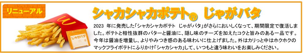 さらに、チキンタツタとともに楽しめるサイドメニュー・デザートドリンクとして、ポテトと相性抜群のバターと醤油に隠し味のチーズを加えたコクと旨みのある「シャカシャカポテト じゃがバタ」がリニューアルして2年ぶりに再登場するほか、瀬戸内産のレモン果汁※を使用したフルーティーですっきりとした酸味とヨーグルト風味の甘味と酸味で爽やかに仕上げた炭酸ドリンク「マックフィズ 瀬戸内レモンヨーグルト味」「マックフロート 瀬戸内レモンヨーグルト味」も新登場いたします。(※レモン果汁1%使用(そのうち瀬戸内産レモン果汁50%配合))