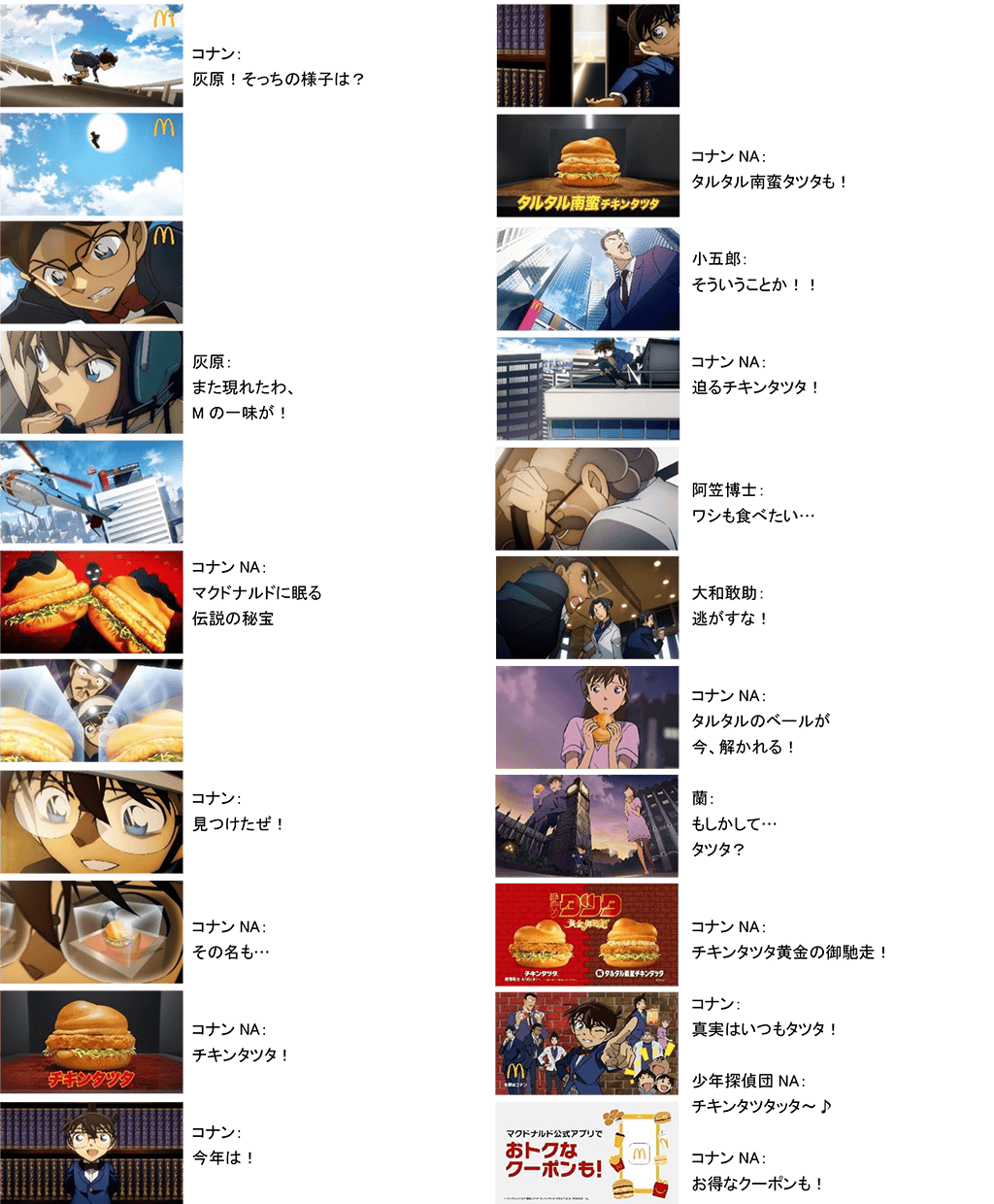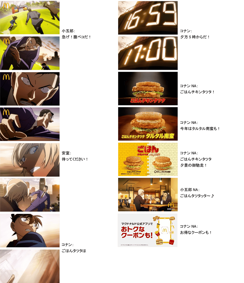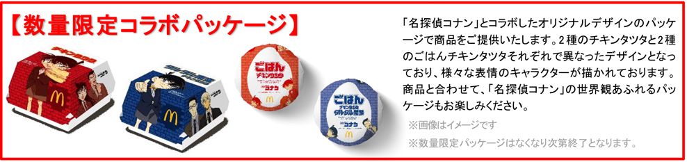 4月15日(火)から放映開始の新TVCMでは、今年も「名探偵コナン」とコラボレーションいたします。コナンのアニメの世界観そのままに、オリジナルの描き下ろし作品となっており、名探偵コナンの人気キャラクターが集結して真実へ迫る「チキンタツタ」と、コナン・小五郎・安室がマクドナルド店舗へ突入する「ごはんチキンタツタ」の2作を放映します。そして、商品をオリジナルコラボデザインの数量限定パッケージでご提供するほか、Xキャンペーンなどの各種施策もご用意しておりますので、あわせてお楽しみください。(詳細は下記を参照)