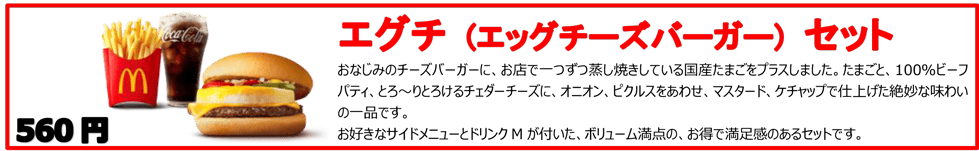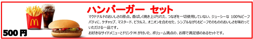 | ハンバーガー | 190円~ | 500円 | レギュラー販売中 | 午前10時30分~閉店まで (24時間営業店舗では 翌午前4時59分まで) |