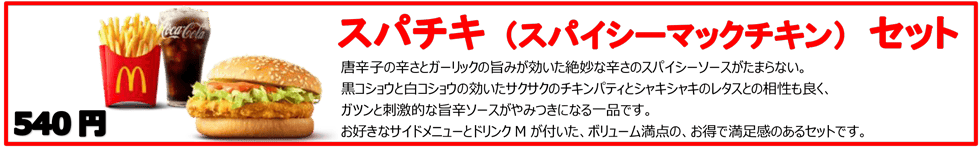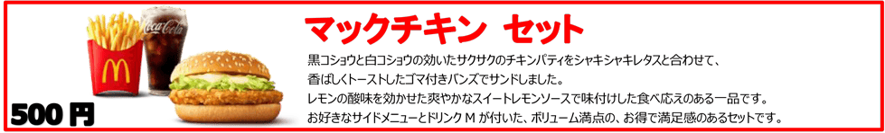 ボリューム感がありながらおトクなバーガー「マックチキン」「スパチキ」「チキチー®」「エグチ」に、選べるサイドメニューとドリンクMがついて、いつでも500円台で楽しめるセットは、『ちょいセット®』として大変多くのお客様にご好評いただいてまいりました。2025年3月12日(水)より、「ハンバーガー」のセットが10年ぶりに復活したことにより、“500円ちょうど”でお手頃に楽しめるセットが、「マックチキン」と合わせて2種類に増え、「スパチキ」「チキチー」「エグチ」のセット3種類と合わせて500円台のセットが合計5種類に進化し、新名称『セット500』に生まれ変わりました。サイドメニューとドリンク付きで440通り※もの組み合わせから選べる楽しさ、ボリューム感と500円台で楽しめる5つのおトクで豊富なラインアップがあることから大変ご好評をいただいております。