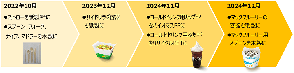 すでに、2022年10月より、ストロー、スプーン、フォーク、ナイフ、マドラーを、2023年12月よりサイドサラダ容器を、2024年11月よりマックフィズ®やマックフロート®などに使用されているコールドドリンクのカップおよびふたを、同12月よりマックフルーリー®の容器を環境に配慮した素材に変更しており、今後も更なるサステナブル素材化を推進してまいります。