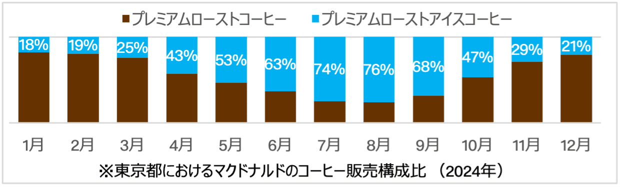 ホット(プレミアムローストコーヒー)よりもアイス(プレミアムローストアイスコーヒー)が飲みたくなる気温は23℃以上という結果が、マクドナルドの販売データから明らかになりました。例えば東京で23℃を超えるのは平均して5月となっており、9月までの5カ月はプレミアムローストアイスコーヒーの方が選ばれやすくなっています。