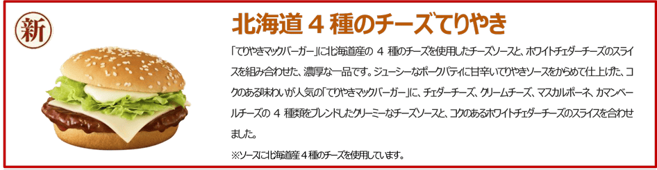 | 北海道4種のチーズてりやき (※ソースに北海道産4種のチーズを 使用しています。) |