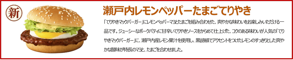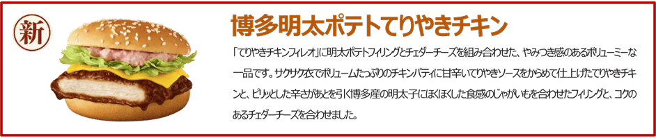 ジューシーなポークパティに甘辛いてりやきソースをからめ、食べ応えとコクのある味わいが楽しめる「てりやきマックバーガー」は、初の日本オリジナルのレギュラーメニューで、1989年の発売以来、多くのお客様に愛され続けているロングセラー商品です。日本生まれの「てりやきマックバーガー」の味わいに、日本のご当地食材を掛け合わせ、今だけお楽しみいただける“てりやき”を届けたいという想いをこめて、北海道・瀬戸内・博多それぞれのご当地食材を使用した“ご当地てりやき”をご用意しました。「北海道4種のチーズてりやき*1」は、「てりやきマックバーガー」に北海道産4種のチーズソースと、ホワイトチェダーチーズのスライスを合わせた、チーズ好きにはたまらない濃厚で食べ応えのある一品です。「瀬戸内レモンペッパーたまごてりやき」は、「てりやきマックバーガー」に瀬戸内産レモン果汁を使用したレモンペッパーマヨとたまごを組み合わせた、爽やかな一品です。そして「博多明太ポテトてりやきチキン」は、「てりやきチキンフィレオ」に博多産の明太子を使用した明太ポテトフィリングとチェダーチーズを合わせた、ボリューミーな一品です。その他、朝から“ご当地てりやき”を味わっていただけるよう、朝マック限定の新商品「北海道4種のチーズてりやきマフィン*1」もご用意いたしました。さらにサイドメニューでも“ご当地”を楽しんでいただけるよう、名古屋名物手羽先をイメージした「シャカシャカポテト 名古屋名物手羽先味」も、黒胡椒の風味がパワーアップし、リニューアルして登場します。今だけしか味わえない全5種の“ご当地のおいしさ”をぜひお楽しみください。(*1 ソースに北海道産4種のチーズを使用しています。)