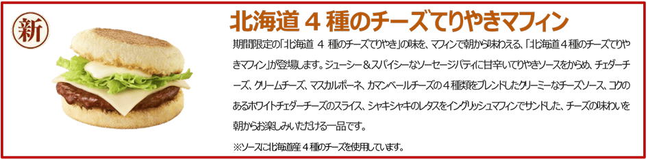 | <朝マック> 北海道4種のチーズてりやきマフィン (※ソースに北海道産4種のチーズを 使用しています。) |