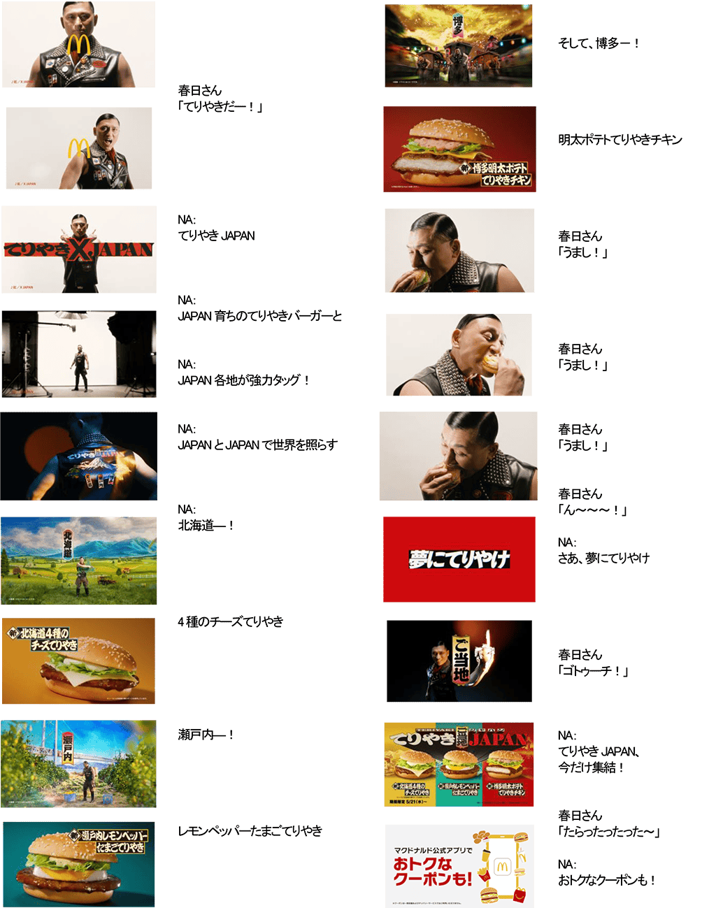新TVCMは、オードリー春日俊彰さんにご出演いただき、テーマソングにはX JAPANの名曲「紅」(作詞/作曲:YOSHIKI)を起用し、春日さんの「てりやきだー!」の掛け声とともに、ジャパン育ちのてりやきバーガーとジャパン各地の食材がタッグを組んだ3種のバーガーが集結する内容となっています。また、Xキャンペーンなど各種施策もあわせてお楽しみください。(詳細は下記を参照)