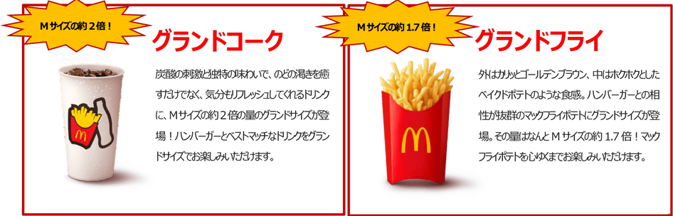 さらに、コカ・コーラがMサイズの約2倍の量になった「グランドコーク*2」や、マックフライポテト®がMサイズの約1.7倍のグランドサイズになった「グランドフライ」が登場し、バリューセット®(Mセット)の「コカ・コーラ」と「マックフライポテト」が+200円でグランドサイズに変更できるお得な「グランドセット」もご一緒にお楽しみいただけます。